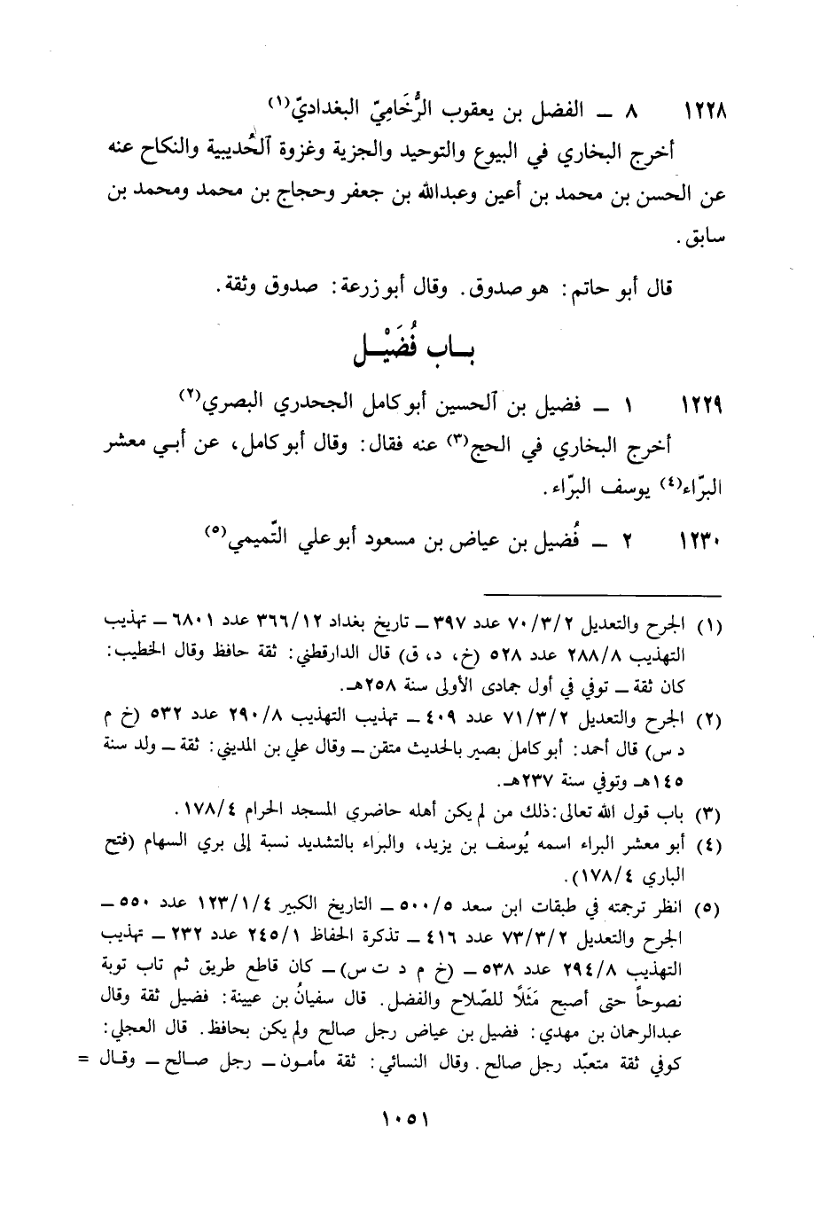 1229 - فُضَيْل بن الْحُسَيْن أَبُو كَامِل الجحدري الْبَصْرِيّ أخرج البُخَارِيّ فِي الْحَج عَنهُ فَقَالَ وَقَالَ أَبُو كَامِل عَن أبي معشر الْبَراء يُوسُف الْبَراء