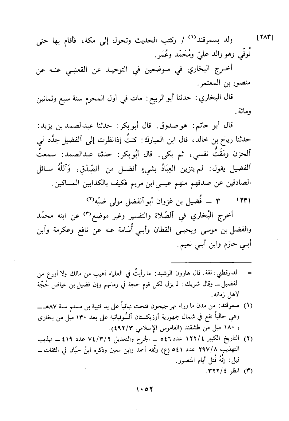 1231 - فُضَيْل بن غَزوَان أَبُو الْفضل مولى ضبة أخرج البُخَارِيّ فِي الصَّلَاة وَالتَّفْسِير وَغير مَوضِع عَن ابْنه مُحَمَّد وَالْفضل بن مُوسَى وَيحيى الْقطَّان وَأبي أُسَامَة عَنهُ عَن نَافِع وَعِكْرِمَة وَابْن أبي حَازِم وَابْن أبي نعيم قَالَ عبد الرَّحْمَن أخبرنَا جرير بن إِسْمَاعِيل فِيمَا كتب لي قَالَ قلت لأبي عبد الله أَحْمد بن حَنْبَل مُحَمَّد بن فُضَيْل قَالَ كَانَ يتشيع قلت أَبوهُ قَالَ أَبوهُ ثِقَة