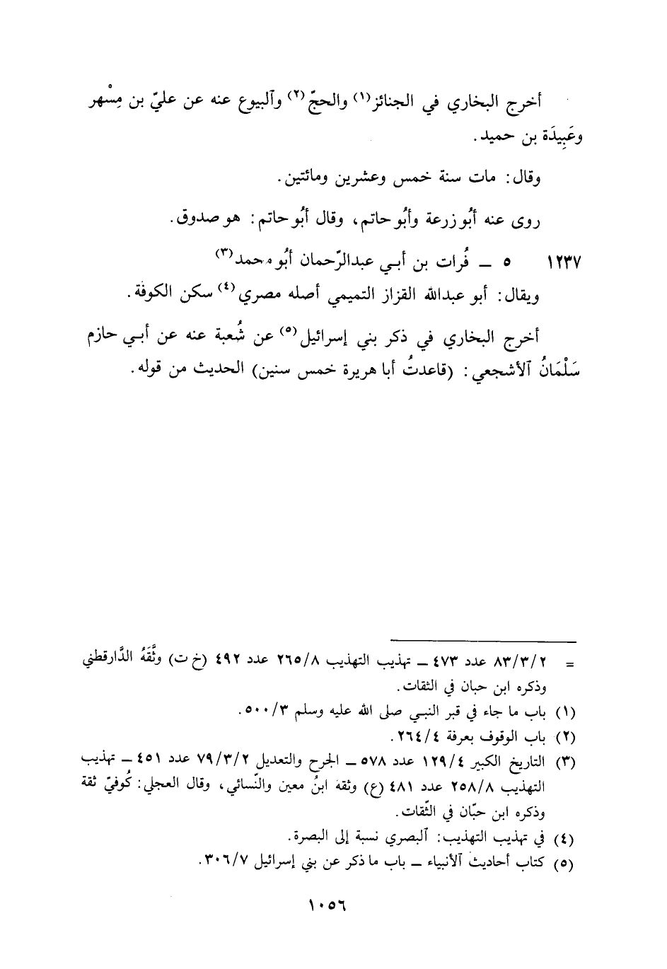 1237 - فرات بن أبي عبد الرَّحْمَن أَبُو مُحَمَّد وَيُقَال أَبُو عبد الله الْقَزاز التَّمِيمِي أَصله مصري سكن الْكُوفَة أخرج البُخَارِيّ فِي ذكر بني إِسْرَائِيل عَن شُعْبَة عَنهُ عَن أبي حَازِم سلمَان الْأَشْجَعِيّ قاعدت أَبَا هُرَيْرَة خمس سِنِين الحَدِيث من قَوْله