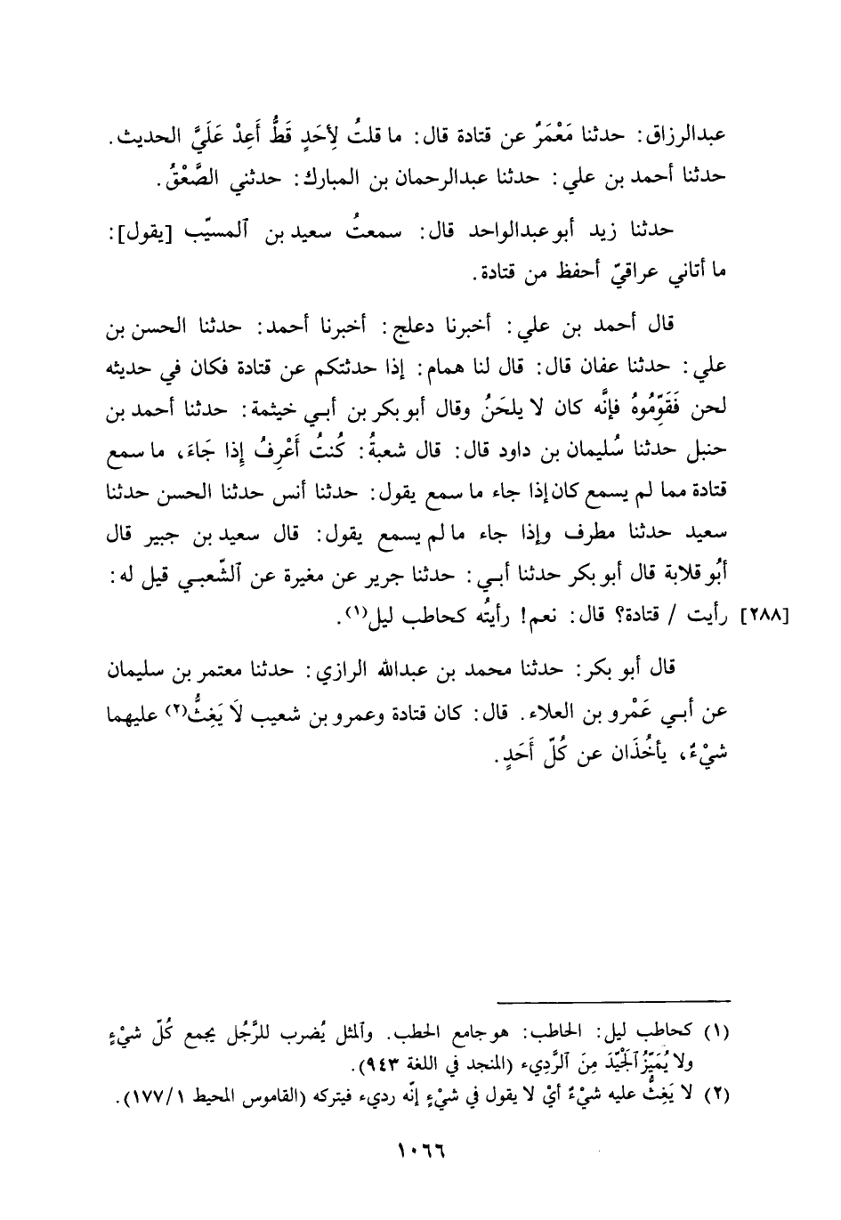 عبد الرَّزَّاق حَدثنَا معمر عَن قَتَادَة قَالَ مَا قلت لأحد قطّ أعد عَليّ الحَدِيث حَدثنَا أَحْمد بن عَليّ حَدثنَا عبد الرَّحْمَن بن الْمُبَارك حَدثنِي الصَّعق حَدثنَا زيد أَبُو عبد الْوَاحِد قَالَ سَمِعت سعيد بن الْمسيب يَقُول مَا أَتَانِي عراقي أحفظ من قَتَادَة قَالَ أَحْمد بن عَليّ أخبرنَا دعْلج أخبرنَا أَحْمد حَدثنَا الْحسن بن عَليّ حَدثنَا عَفَّان قَالَ قَالَ لنا همام إِذا حدثتكم عَن قَتَادَة فَكَانَ فِي حَدِيثه لحن فقوموه فَإِنَّهُ كَانَ لَا يلحن وَقَالَ أَبُو بكر بن أبي خَيْثَمَة حَدثنَا أَحْمد بن حَنْبَل حَدثنَا سُلَيْمَان بن دَاوُد قَالَ قَالَ شُعْبَة كنت أعرف إِذا جَاءَ مَا سمع قَتَادَة مِمَّا لم يسمع كَانَ إِذا جَاءَ مَا سمع يَقُول حَدثنَا أنس حَدثنَا الْحسن حَدثنَا سعيد حَدثنَا مطرف وَإِذا جَاءَ مَا لم يسمع يَقُول قَالَ سعيد بن جُبَير قَالَ أَبُو قلَابَة قَالَ أَبُو بكر حَدثنَا أبي حَدثنَا جرير عَن مُغيرَة عَن الشّعبِيّ قيل لَهُ رَأَيْت قَتَادَة قَالَ نعم رَأَيْته كحاطب ليل قَالَ أَبُو بكر حَدثنَا مُحَمَّد بن عبد الله الرَّازِيّ حَدثنَا مُعْتَمر بن سُلَيْمَان عَن أبي عَمْرو بن الْعَلَاء قَالَ كَانَ قَتَادَة وَعَمْرو بن شُعَيْب لَا يغث عَلَيْهِمَا شَيْء يأخذان عَن كل أحد