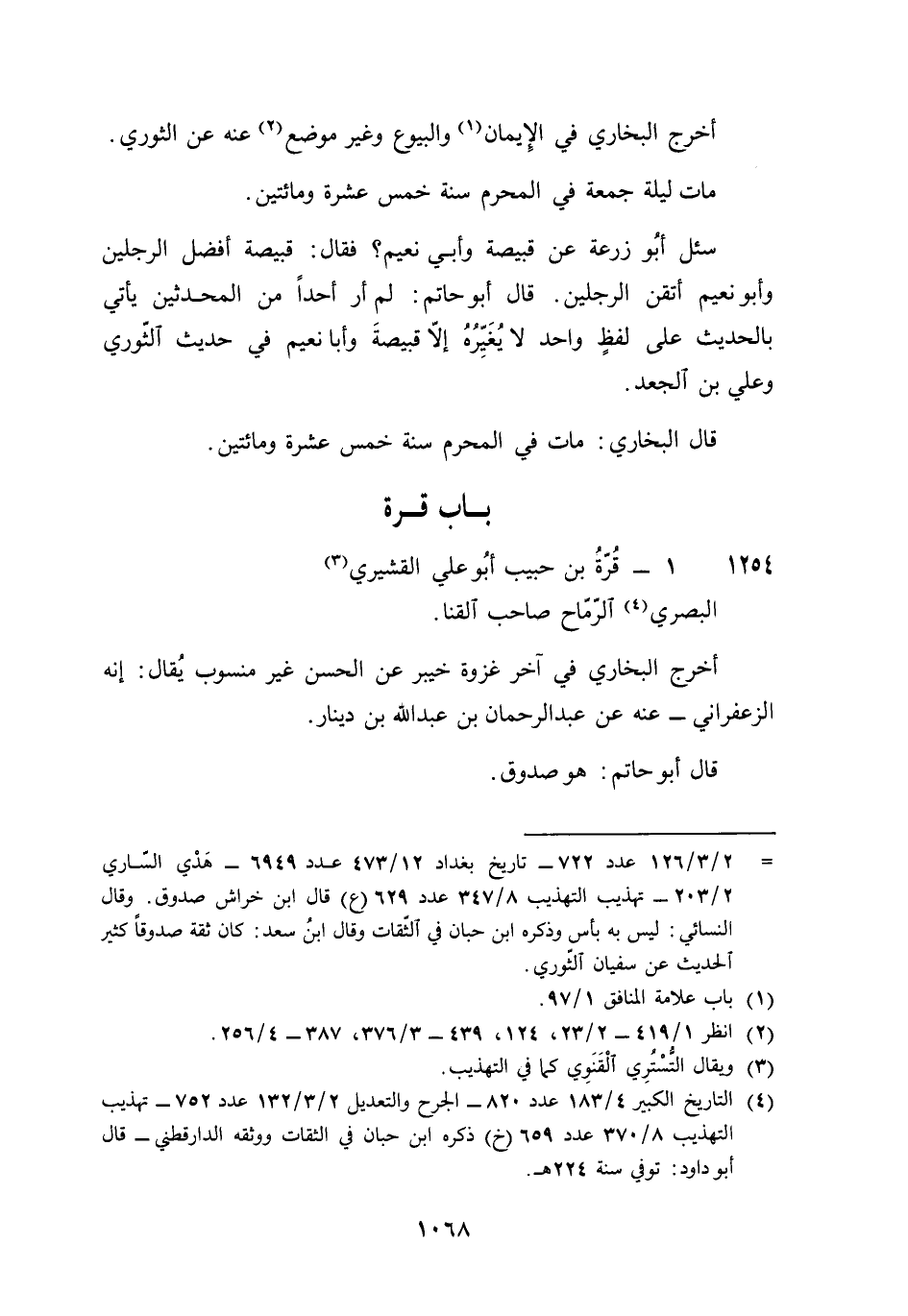 1254 - قُرَّة بن حبيب أَبُو عَليّ الْقشيرِي الْبَصْرِيّ الرماح صَاحب القنا أخرج البُخَارِيّ فِي آخر غَزْوَة خَيْبَر عَن الْحسن غير مَنْسُوب يُقَال إِنَّه الزَّعْفَرَانِي عَنهُ عَن عبد الرَّحْمَن بن عبد الله بن دِينَار قَالَ أَبُو حَاتِم هُوَ صَدُوق