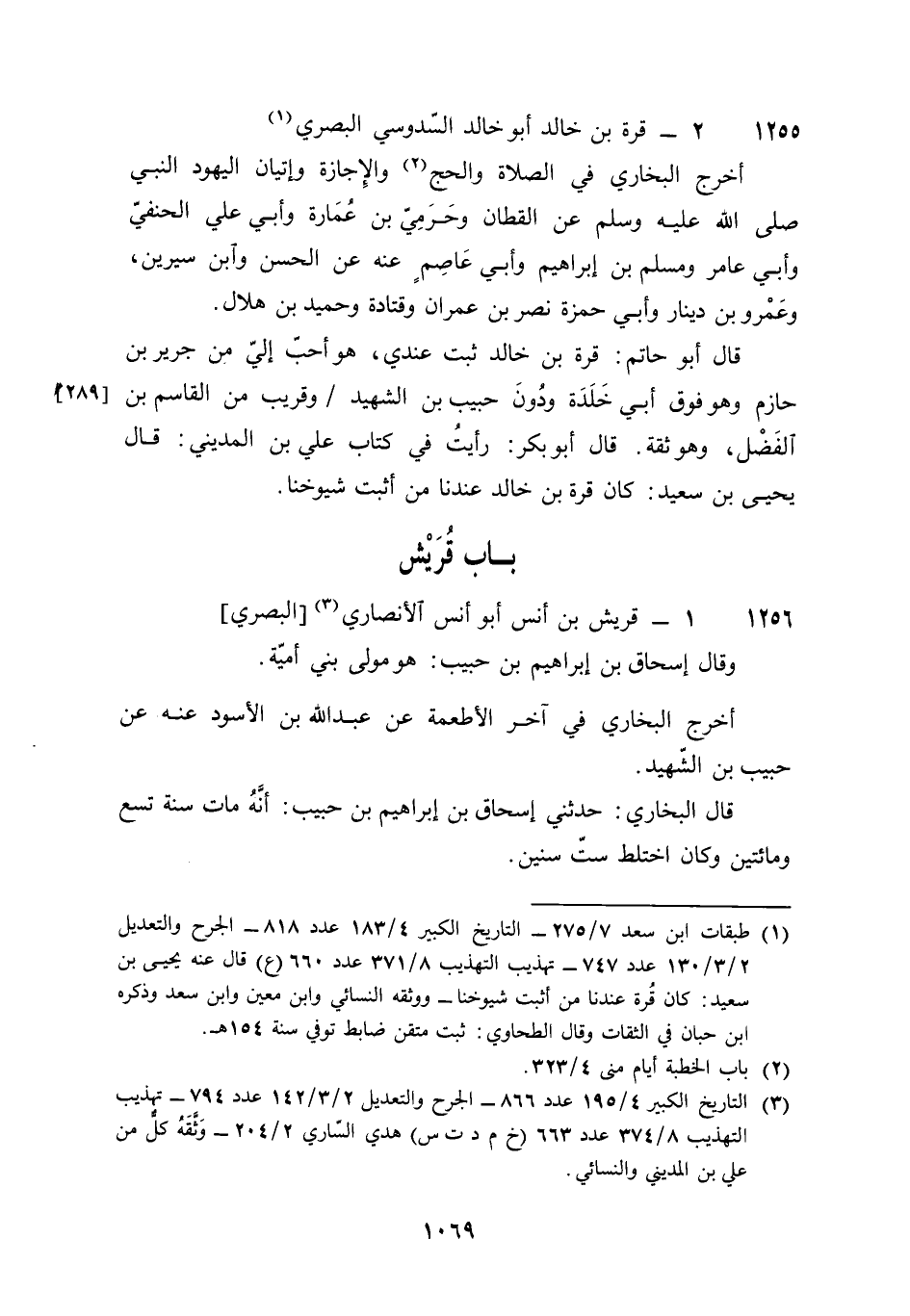 1255 - قُرَّة بن خَالِد أَبُو خَالِد السدُوسِي الْبَصْرِيّ أخرج البُخَارِيّ فِي الصَّلَاة وَالْحج وَالْإِجَازَة وإتيان الْيَهُود النَّبِي صلى الله عَلَيْهِ وَسلم عَن الْقطَّان وحرمي بن عمَارَة وَأبي عَليّ الْحَنَفِيّ وَأبي عَامر وَمُسلم بن إِبْرَاهِيم وَأبي عَاصِم عَنهُ عَن الْحسن وَابْن سِيرِين وَعَمْرو بن دِينَار وَأبي حَمْزَة نصر بن عمرَان وَقَتَادَة وَحميد بن هِلَال قَالَ أَبُو حَاتِم قُرَّة بن خَالِد ثَبت عِنْدِي هُوَ أحب الي من جرير بن حَازِم وَهُوَ فَوق أبي خلدَة وَدون حبيب بن الشَّهِيد وَقَرِيب من الْقَاسِم بن الْفضل وَهُوَ ثِقَة قَالَ أَبُو بكر رَأَيْت فِي كتاب عَليّ بن الْمَدِينِيّ قَالَ يحيى بن سعيد كَانَ قُرَّة بن خَالِد عندنَا من أثبت شُيُوخنَا