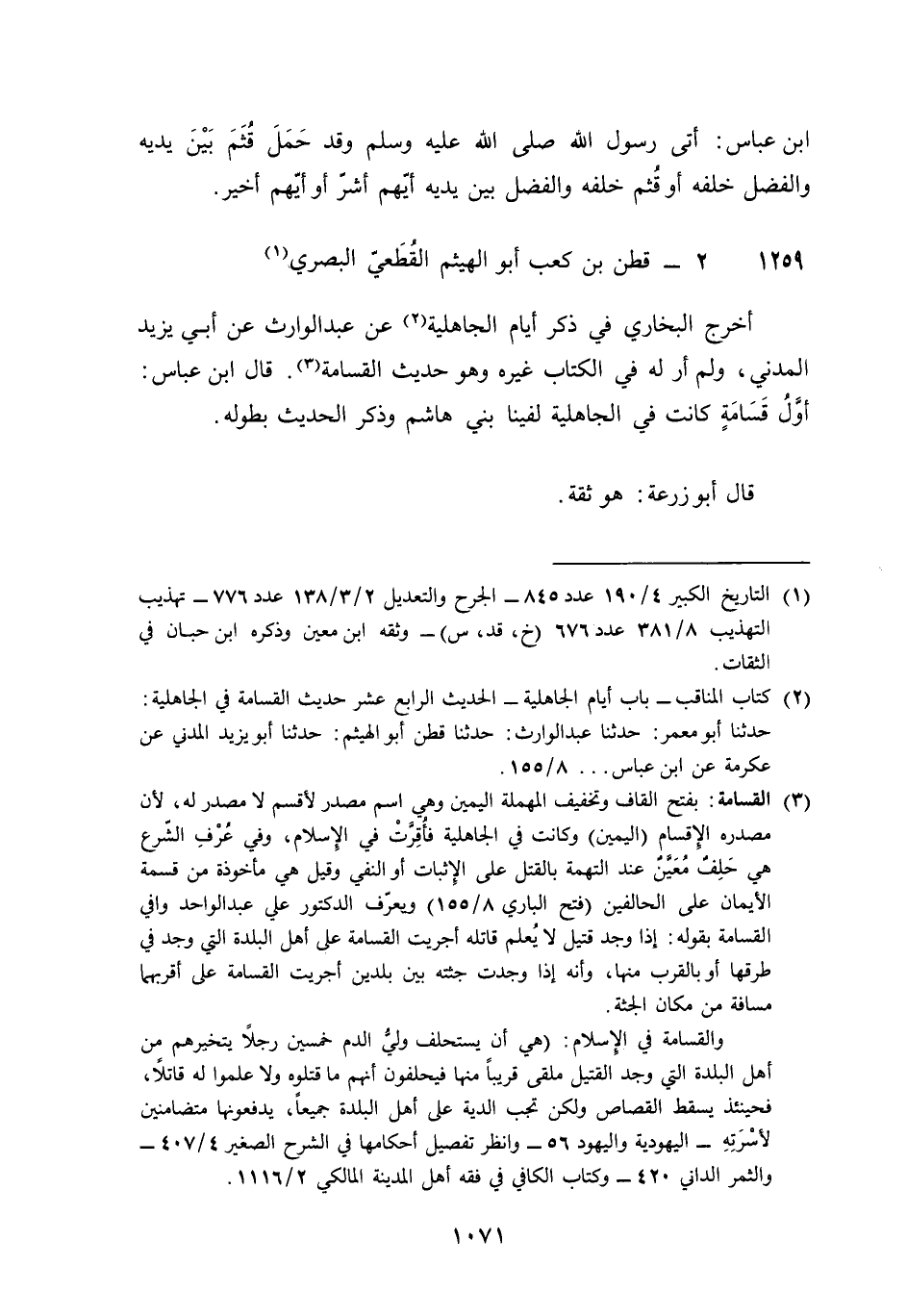 1259 - قطن بن كَعْب أَبُو الْهَيْثَم الْقطعِي الْبَصْرِيّ أخرج البُخَارِيّ فِي ذكر أَيَّام الْجَاهِلِيَّة عَن عبد الْوَارِث عَن أبي يزِيد الْمدنِي وَلم أر لَهُ فِي الْكتاب غَيره وَهُوَ حَدِيث الْقسَامَة قَالَ بن عَبَّاس أول قسَامَة كَانَت فِي الْجَاهِلِيَّة لفينا بني هَاشم وَذكر الحَدِيث بِطُولِهِ قَالَ أَبُو زرْعَة هُوَ ثِقَة