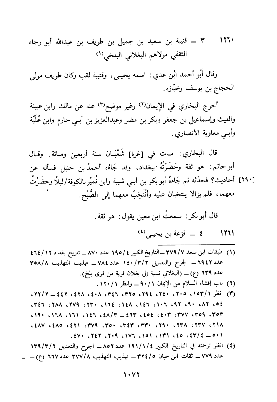 1260 - قُتَيْبَة بن سعيد بن جميل بن طريف بن عبد الله أَبُو رَجَاء الثَّقَفِيّ مَوْلَاهُم البغلاني الْبَلْخِي وَقَالَ أَبُو أَحْمد بن عدي اسْمه يحيى وقتيبة لقب وَكَانَ طريف مولى الْحجَّاج بن يُوسُف وخبازه أخرج البُخَارِيّ فِي الْإِيمَان وَغير مَوضِع عَنهُ عَن مَالك وَابْن عُيَيْنَة وَاللَّيْث وَإِسْمَاعِيل بن جَعْفَر وَبكر بن مُضر وَعبد الْعَزِيز بن أبي حَازِم وَابْن علية وَأبي مُعَاوِيَة الْأنْصَارِيّ قَالَ البُخَارِيّ مَاتَ فِي غرَّة شعْبَان سنة أَرْبَعِينَ وَمِائَة وَقَالَ أَبُو حَاتِم هُوَ ثِقَة وحضرته بِبَغْدَاد وَقد جَاءَهُ أَحْمد بن حَنْبَل فَسَأَلَهُ عَن أَحَادِيث فحدثه ثمَّ جَاءَهُ أَبُو بكر بن أبي شيبَة وَابْن نمير بِالْكُوفَةِ لَيْلًا وَحَضَرت مَعَهُمَا فَلم يَزَالَا ينتخبان عَلَيْهِ وأنتخب مَعَهُمَا الى الصُّبْح قَالَ أَبُو بكر سَمِعت بن معِين يَقُول هُوَ ثِقَة