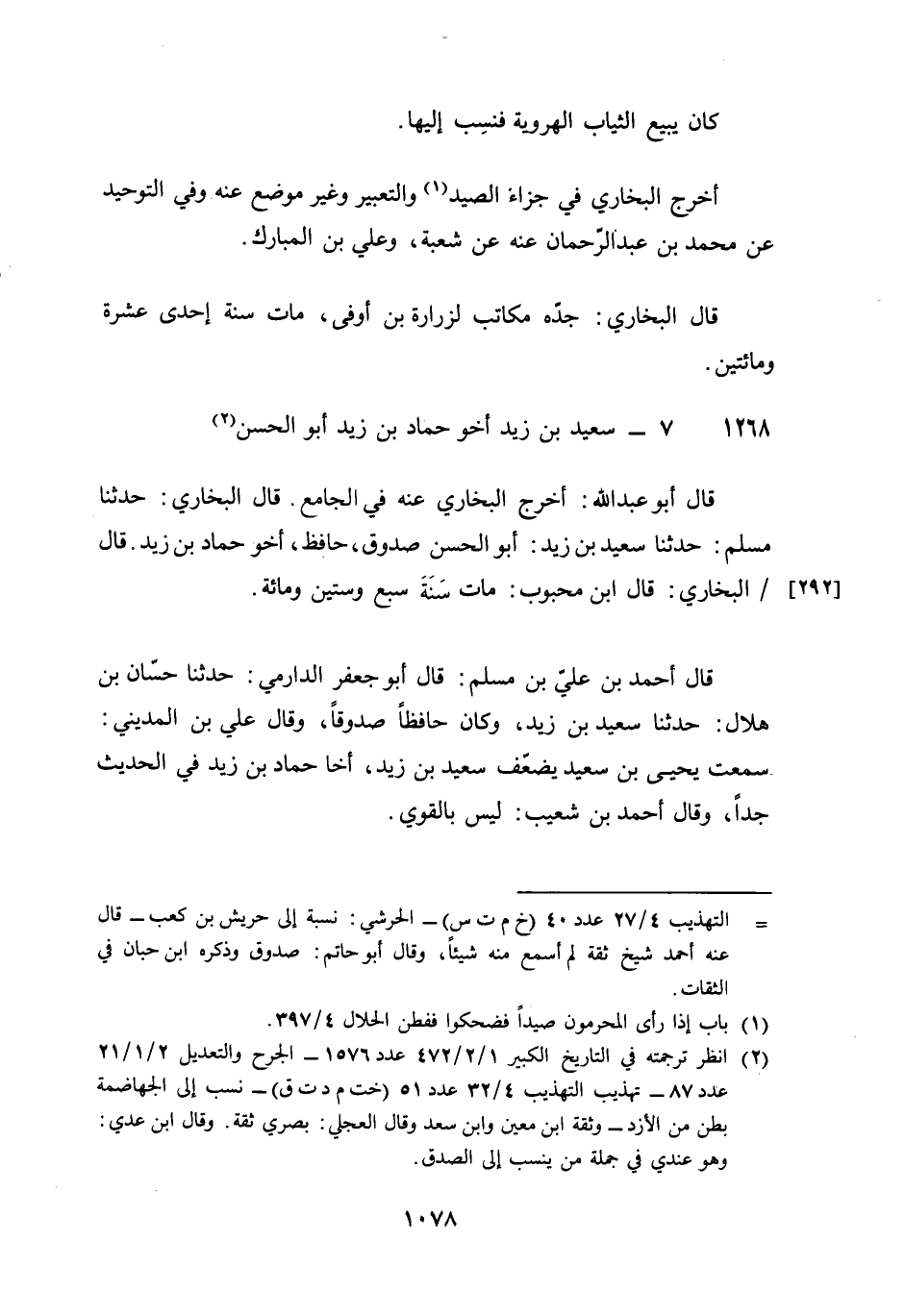 1268 - سعيد بن زيد أَخُو حَمَّاد بن زيد أَبُو الْحسن قَالَ أَبُو عبد الله أخرج البُخَارِيّ عَنهُ فِي الْجَامِع قَالَ البُخَارِيّ حَدثنَا مُسلم حَدثنَا سعيد بن زيد أَبُو الْحسن صَدُوق حَافظ أَخُو حَمَّاد بن زيد قَالَ البُخَارِيّ قَالَ بن مَحْبُوب مَاتَ سنة سبع وَسِتِّينَ وَمِائَة قَالَ أَحْمد بن عَليّ بن مُسلم قَالَ أَبُو جَعْفَر الدَّارمِيّ حَدثنَا حسان بن هِلَال حَدثنَا سعيد بن زيد وَكَانَ حَافِظًا صَدُوقًا وَقَالَ عَليّ بن الْمَدِينِيّ سَمِعت يحيى بن سعيد يضعف سعيد بن زيد أَخا حَمَّاد بن زيد فِي الحَدِيث جدا وَقَالَ أَحْمد بن شُعَيْب لَيْسَ بِالْقَوِيّ