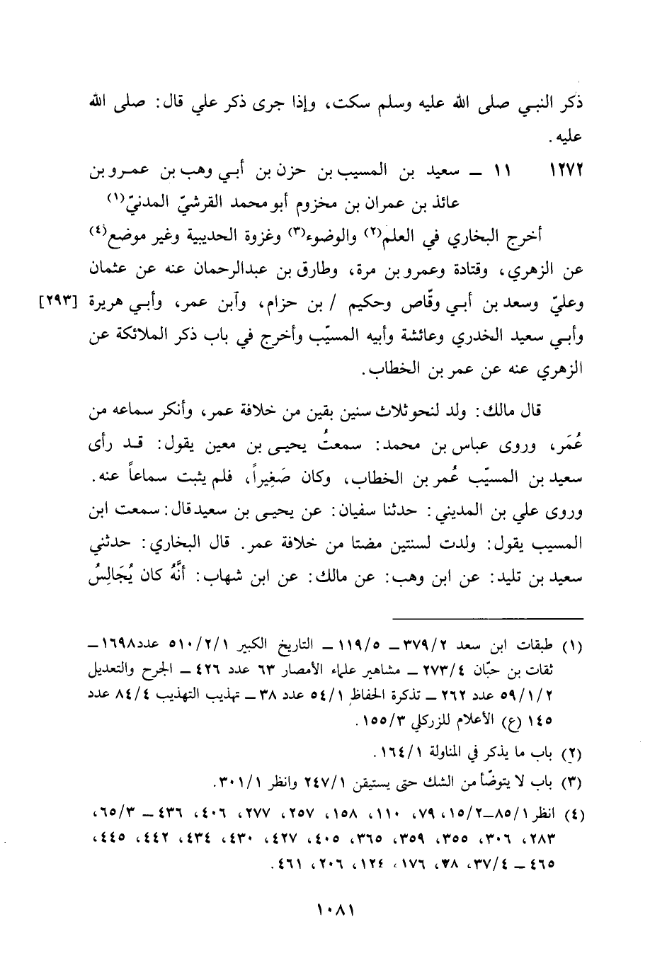 1272 - سعيد بن الْمسيب بن حزن بن أبي وهب بن عَمْرو بن عَائِذ بن عمرَان بن مَخْزُوم أَبُو مُحَمَّد الْقرشِي الْمدنِي أخرج البُخَارِيّ فِي الْعلم وَالْوُضُوء وغزوة الْحُدَيْبِيَة وَغير مَوضِع عَن الزُّهْرِيّ وَقَتَادَة وَعَمْرو بن مرّة وطارق بن عبد الرَّحْمَن عَنهُ عَن عُثْمَان وَعلي وَسعد بن أبي وَقاص وَحَكِيم بن حزَام وَابْن عمر وَأبي هُرَيْرَة وَأبي سعيد الْخُدْرِيّ وَعَائِشَة وَأَبِيهِ الْمسيب وَأخرج فِي بَاب ذكر الْمَلَائِكَة عَن الزُّهْرِيّ عَنهُ عَن عمر بن الْخطاب قَالَ مَالك ولد لنَحْو ثَلَاث سِنِين بَقينَ من خلَافَة عمر وَأنكر سَمَاعه من عمر وروى عَبَّاس بن مُحَمَّد سَمِعت يحيى بن معِين يَقُول قد رأى سعيد بن الْمسيب عمر بن الْخطاب وَكَانَ صَغِيرا فَلم يثبت سَمَاعا عَنهُ وروى عَليّ بن الْمَدِينِيّ حَدثنَا سُفْيَان عَن يحيى بن سعيد قَالَ سَمِعت بن الْمسيب يَقُول ولدت لِسنتَيْنِ مضتا من خلَافَة عمر قَالَ البُخَارِيّ حَدثنِي سعيد بن تليد عَن بن وهب عَن مَالك عَن بن شهَاب أَنه كَانَ يُجَالس