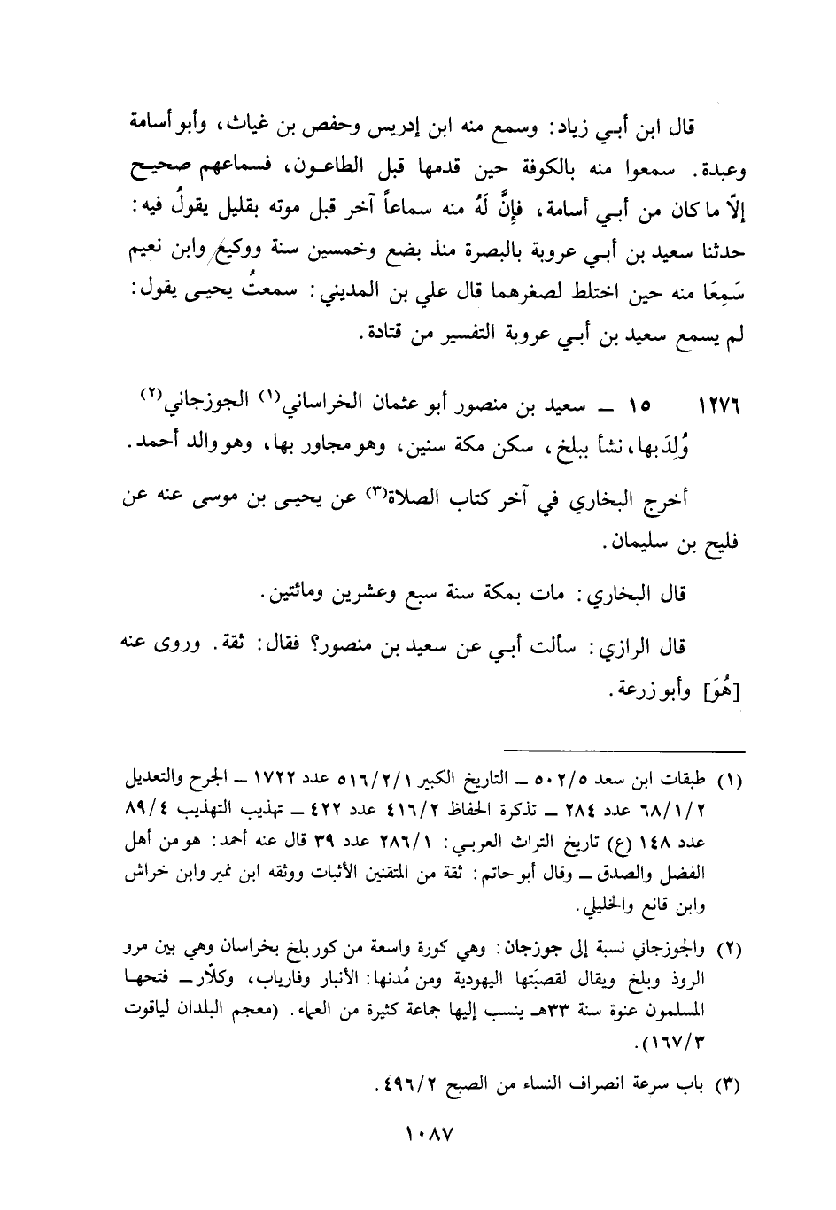 1276 - سعيد بن مَنْصُور أَبُو عُثْمَان الْخُرَاسَانِي الْجوزجَاني ولد بهَا نَشأ ببلخ سكن مَكَّة سِنِين وَهُوَ مجاور بهَا وَهُوَ وَالِد أَحْمد أخرج البُخَارِيّ فِي آخر كتاب الصَّلَاة عَن يحيى بن مُوسَى عَنهُ عَن فليح بن سُلَيْمَان قَالَ البُخَارِيّ مَاتَ بِمَكَّة سنة سبع وَعشْرين وَمِائَتَيْنِ قَالَ الرَّازِيّ سَأَلت أبي عَن سعيد بن مَنْصُور فَقَالَ ثِقَة وروى عَنهُ هُوَ وَأَبُو زرْعَة