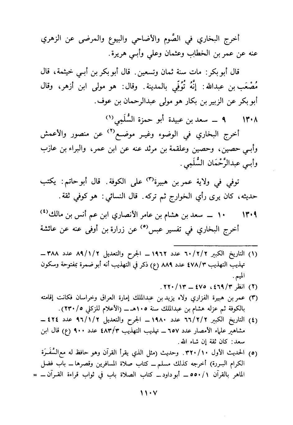 1309 - سعد بن هِشَام بن عَامر الْأنْصَارِيّ بن عَم أنس بن مَالك أخرج البُخَارِيّ فِي تَفْسِير عبس عَن زُرَارَة بن أوفى عَنهُ عَن عَائِشَة عَن النَّبِي صلى الله عَلَيْهِ وَسلم مثل الَّذِي يقْرَأ الْقرَان وَهُوَ حَافظ لَهُ مَعَ السفرة الْكِرَام البررة قتل بِأَرْض مكران قَالَ النَّسَائِيّ هُوَ ثِقَة