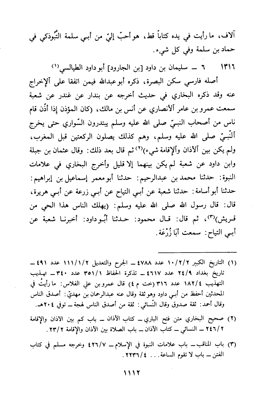 1316 - سُلَيْمَان بن دَاوُد بن الْجَارُود أَبُو دَاوُد الطَّيَالِسِيّ أَصله فَارسي سكن الْبَصْرَة ذكره أَبُو عبد الله فِيمَن اتفقَا على الْإِخْرَاج عَنهُ وَقد ذكره البُخَارِيّ فِي حَدِيث أخرجه عَن بنْدَار عَن غنْدر عَن شُعْبَة سَمِعت عَمْرو بن عَامر الْأنْصَارِيّ عَن أنس بن مَالك كَانَ الْمُؤَذّن إِذا أذن قَامَ نَاس من أَصْحَاب النَّبِي صلى الله عَلَيْهِ وَسلم يبتدرون السَّوَارِي حَتَّى يخرج النَّبِي صلى الله عَلَيْهِ وَسلم وهم كَذَلِك يصلونَ الرَّكْعَتَيْنِ قبل الْمغرب وَلم يكن بَين الْأَذَان وَالْإِقَامَة شَيْء ثمَّ قَالَ بعد ذَلِك وَقَالَ عُثْمَان بن جبلة وَابْن دَاوُد عَن شُعْبَة لم يكن بَينهمَا إِلَّا قَلِيل وَأخرج البُخَارِيّ فِي عَلَامَات النُّبُوَّة حَدثنَا مُحَمَّد بن عبد الرَّحِيم حَدثنَا أَبُو معمر إِسْمَاعِيل بن إِبْرَاهِيم حَدثنَا أَبُو أُسَامَة حَدثنَا شُعْبَة عَن أبي التياح عَن أبي زرْعَة عَن أبي هُرَيْرَة قَالَ قَالَ رَسُول الله صلى الله عَلَيْهِ وَسلم يهْلك النَّاس هَذَا الْحَيّ من قُرَيْش ثمَّ قَالَ قَالَ مَحْمُود حَدثنَا أَبُو دَاوُد أخبرنَا شُعْبَة عَن أبي التياح سَمِعت أَبَا زرْعَة