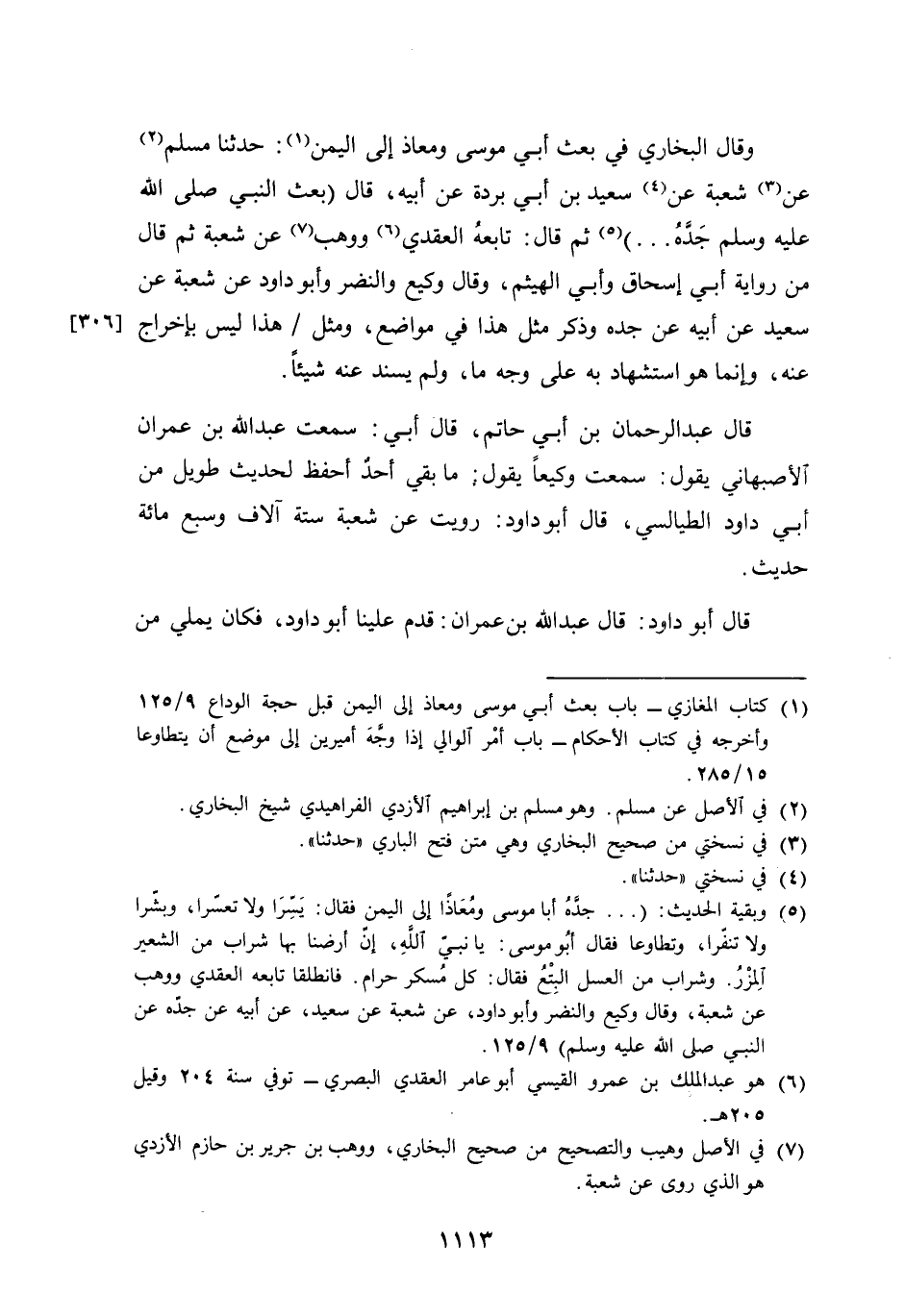 وَقَالَ البُخَارِيّ فِي بعث أبي مُوسَى ومعاذ الى الْيمن حَدثنَا مُسلم عَن شُعْبَة عَن سعيد بن أبي بردة عَن أَبِيه قَالَ بعث النَّبِي صلى الله عَلَيْهِ وَسلم جده ثمَّ قَالَ تَابعه الْعَقدي ووهب عَن شُعْبَة ثمَّ قَالَ من رِوَايَة أبي إِسْحَاق وَأبي الْهَيْثَم وَقَالَ وَكِيع وَالنضْر وَأَبُو دَاوُد عَن شُعْبَة عَن سعيد عَن أَبِيه عَن جده وَذكر مثل هَذَا فِي مَوَاضِع وَمثل هَذَا لَيْسَ بِإِخْرَاج عَنهُ وَإِنَّمَا هُوَ استشهاد بِهِ على وَجه مَا وَلم يسند عَنهُ شَيْئا قَالَ عبد الرَّحْمَن بن أبي حَاتِم قَالَ أبي سَمِعت عبد الله بن عمرَان الْأَصْبَهَانِيّ يَقُول سَمِعت وكيعا يَقُول مَا بَقِي أحد أحفظ لحَدِيث طَوِيل من أبي دَاوُد الطَّيَالِسِيّ قَالَ أَبُو دَاوُد رويت عَن شُعْبَة سِتَّة آلَاف وَسبع مائَة حَدِيث قَالَ أَبُو دَاوُد قَالَ عبد الله بن عمرَان قدم علينا أَبُو دَاوُد فَكَانَ يملي من حفظه قَالَ أَبُو حَاتِم أَبُو دَاوُد مُحدث صَدُوق كثير الْخَطَأ أَبُو الْوَلِيد وَعَفَّان أحب إِلَيّ مِنْهُ قَالَ عبد الرَّحْمَن سُئِلَ أبي عَن أبي دَاوُد وَأبي أَحْمد الزبيرِي أَيهمَا أحفظ فَقَالَ أَبُو دَاوُد قَالَ عبد الرَّحْمَن كتب إِلَيّ يَعْقُوب بن إِسْحَاق الْهَرَوِيّ قَالَ عُثْمَان بن سعيد الدَّارمِيّ قلت ليحيى بن معِين أَبُو دَاوُد أحب إِلَيْك فِي شُعْبَة وحرمي يَعْنِي بن عمَارَة فَقَالَ أَبُو دَاوُد صَدُوق أَبُو دَاوُد أحب إِلَيّ قلت فَأَبُو دَاوُد أَو عبد الرَّحْمَن بن مهْدي فَقَالَ أَبُو دَاوُد أعلم بِهِ وَهَذَا الْكَلَام فِيهِ نظر لِأَن عبد الرَّحْمَن بن مهْدي إِمَام مقدم فِي طبقته لَا يوازيه إِلَّا يحيى بن سعيد الْقطَّان وَلَيْسَ أَبُو دَاوُد من هَذَا النمط وَلَا قريب وَإِن كَانَ أَكثر رِوَايَة عَن شُعْبَة وَهُوَ الَّذِي أَرَادَهُ يحيى بن معِين فَإِن عبد الرَّحْمَن بن مهْدي أعلم وَأبْصر بِصَحِيح الحَدِيث من سقيمه وَإِمَام فِي الْجرْح وَالتَّعْدِيل وَأما أَبُو دَاوُد فكثير الرِّوَايَة وَلَيْسَ لَهُ ذَلِك الميز وَلذَلِك يخطىء كثيرا وحسبك أَن أَبَا حَاتِم قَالَ أَبُو الْوَلِيد وَعَفَّان أحب إِلَيّ مِنْهُ ولعمري لقد رَفعه إِلَى أَن فَاضل بَينه وَبَين أرفع من طبقته لِأَن أَبَا الْوَلِيد وَعَفَّان متقدمان فِي الْحِفْظ والإتقان وَقد ترك البُخَارِيّ الْإِخْرَاج عَنهُ وَقَول أبي حَاتِم هُوَ أحفظ من أبي أَحْمد الزبيرِي يُرِيد سَعَة الرِّوَايَة واستظهاره بِمَا يرويهِ وَأَبُو أَحْمد أنقى حَدِيثا مِنْهُ وَكَذَلِكَ حرمي بن عمَارَة وَالله أعلم