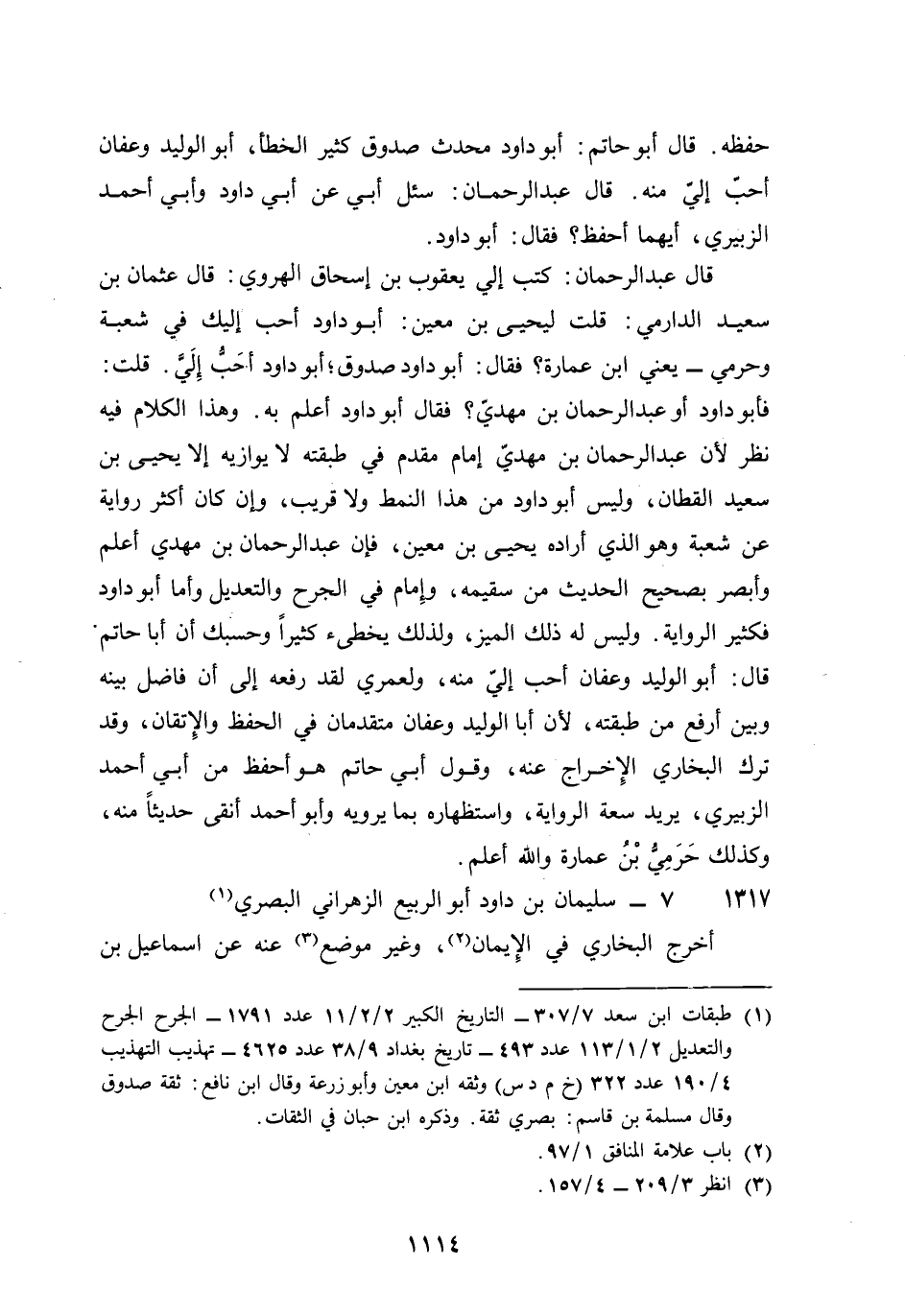 1317 - سُلَيْمَان بن دَاوُد أَبُو الرّبيع الزهْرَانِي الْبَصْرِيّ أخرج البُخَارِيّ فِي الْإِيمَان وَغير مَوضِع عَنهُ عَن إِسْمَاعِيل بن جَعْفَر وَإِسْمَاعِيل بن زَكَرِيَّا وفليح بن مُوسَى قَالَ البُخَارِيّ مَاتَ آخر سنة أَربع وَثَلَاثِينَ وَمِائَتَيْنِ قَالَ أَبُو حَاتِم هُوَ ثِقَة وَسُئِلَ عَليّ بن الْمَدِينِيّ عَمَّن يكْتب من أَصْحَاب حَمَّاد فَقَالَ عَن أبي الرّبيع الزهْرَانِي