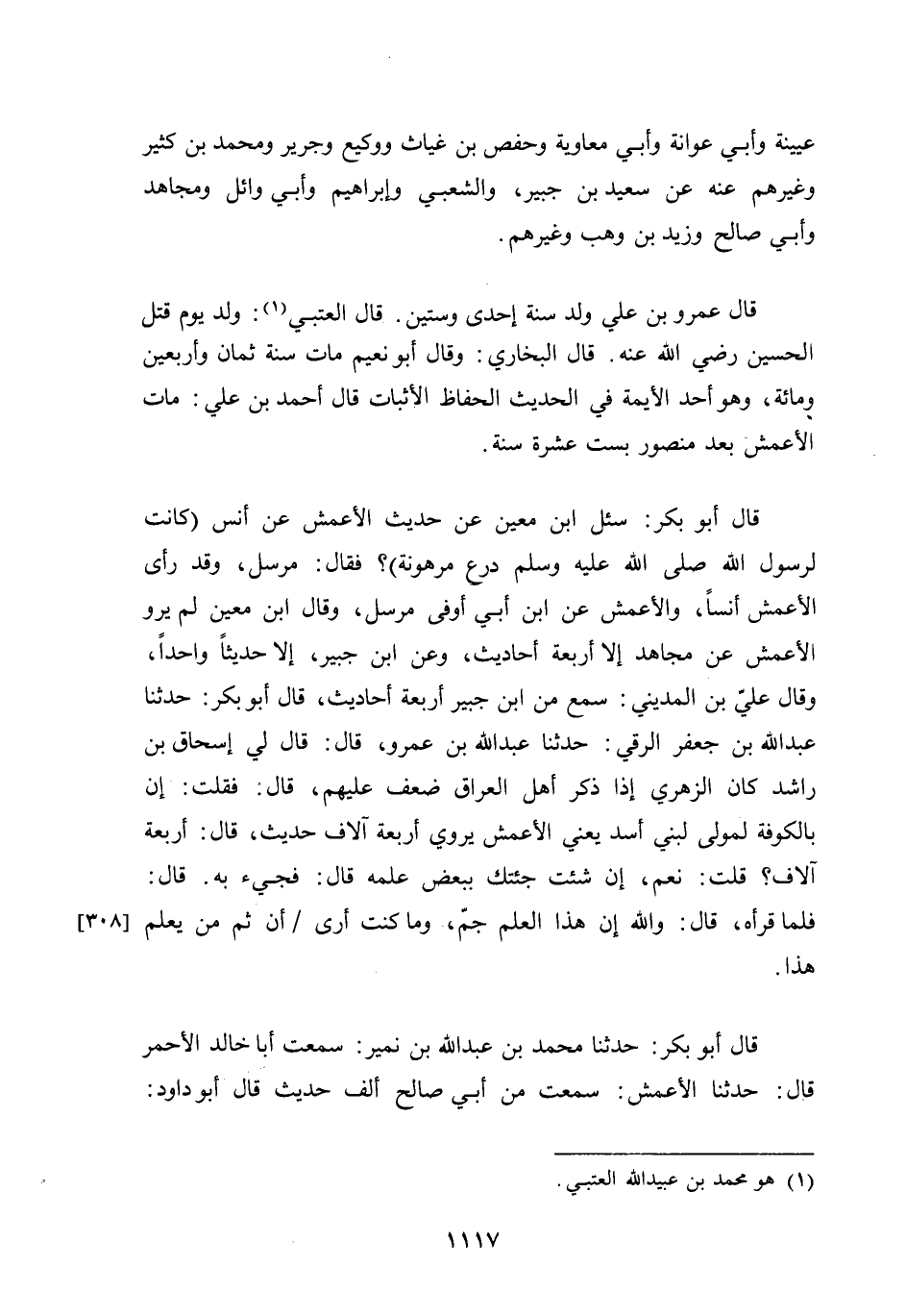 عُيَيْنَة وَأبي عوَانَة وَأبي مُعَاوِيَة وَحَفْص بن غياث ووكيع وَجَرِير وَمُحَمّد بن كثير وَغَيرهم عَنهُ عَن سعيد بن جُبَير وَالشعْبِيّ وَإِبْرَاهِيم وَأبي وَائِل وَمُجاهد وَأبي صَالح وَزيد بن وهب وَغَيرهم قَالَ عَمْرو بن عَليّ ولد سنة إِحْدَى وَسِتِّينَ قَالَ الْعُتْبِي ولد يَوْم قتل الْحُسَيْن رَضِي الله عَنهُ قَالَ البُخَارِيّ وَقَالَ أَبُو نعيم مَاتَ سنة ثَمَان وَأَرْبَعين وَمِائَة وَهُوَ أحد الأيمة فِي الحَدِيث الْحفاظ الْأَثْبَات قَالَ أَحْمد بن عَليّ مَاتَ الْأَعْمَش بعد مَنْصُور بست عشرَة سنة قَالَ أَبُو بكر سُئِلَ بن معِين عَن حَدِيث الْأَعْمَش عَن أنس كَانَت لرَسُول الله صلى الله عَلَيْهِ وَسلم درع مَرْهُونَة فَقَالَ مُرْسل وَقد رأى الْأَعْمَش أنسا وَالْأَعْمَش عَن بن أبي أوفى مُرْسل وَقَالَ بن معِين لم يرو الْأَعْمَش عَن مُجَاهِد إِلَّا أَرْبَعَة أَحَادِيث وَعَن بن جُبَير إِلَّا حَدِيثا وَاحِدًا وَقَالَ عَليّ بن الْمَدِينِيّ سمع من بن جُبَير أَرْبَعَة أَحَادِيث قَالَ أَبُو بكر حَدثنَا عبد الله بن جَعْفَر الرقي حَدثنَا عبد الله بن عَمْرو قَالَ قَالَ لي إِسْحَاق بن رَاشد كَانَ الزُّهْرِيّ إِذا ذكر أهل الْعرَاق ضعف عَلَيْهِم قَالَ فَقلت إِن بِالْكُوفَةِ لمولى لبني أَسد يَعْنِي الْأَعْمَش يروي أَرْبَعَة آلَاف حَدِيث قَالَ أَرْبَعَة آلَاف قلت نعم إِن شِئْت جئْتُك بِبَعْض علمه قَالَ فجىء بِهِ قَالَ فَلَمَّا قَرَأَهُ قَالَ وَالله إِن هَذَا الْعلم جم وَمَا كنت أرى أَن ثمَّ من يعلم هَذَا قَالَ أَبُو بكر حَدثنَا مُحَمَّد بن عبد الله بن نمير سَمِعت أَبَا خَالِد الْأَحْمَر قَالَ حَدثنَا الْأَعْمَش سَمِعت من أبي صَالح ألف حَدِيث قَالَ أَبُو دَاوُد الْأَعْمَش وَالزهْرِيّ وَقَتَادَة لَا يُقَاس بهم أحد قَالَ الْأَعْمَش أَنا مِمَّن رَفعه الله بِالْقُرْآنِ وَلَوْلَا ذَلِك لَكَانَ على رقبتي دن صحناة أبيعه