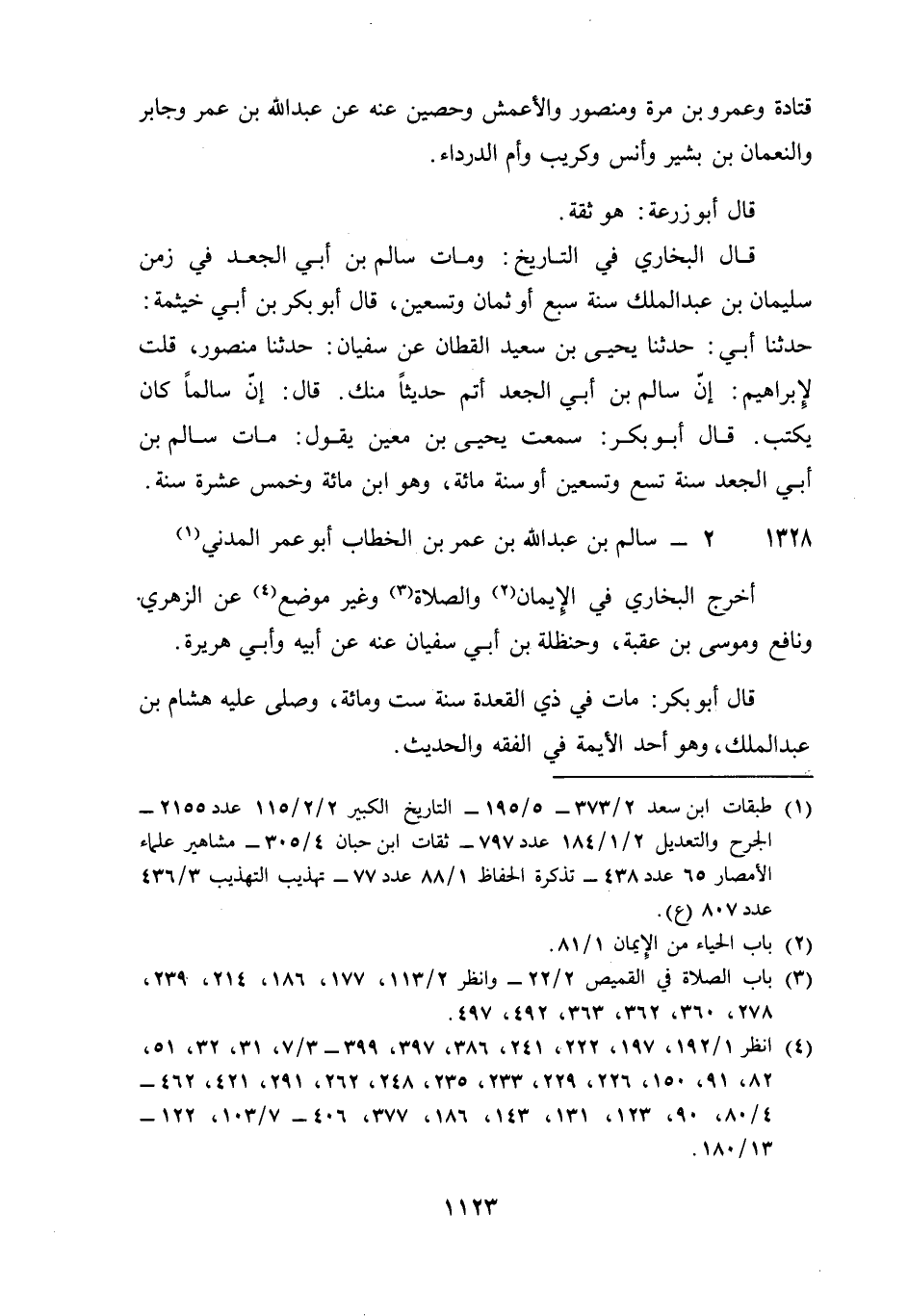 1328 - سَالم بن عبد الله بن عمر بن الْخطاب أَبُو عمر الْمدنِي أخرج البُخَارِيّ فِي الْإِيمَان وَالصَّلَاة وَغير مَوضِع عَن الزُّهْرِيّ وَنَافِع ومُوسَى بن عقبَة وحَنْظَلَة بن أبي سُفْيَان عَنهُ عَن أَبِيه وَأبي هُرَيْرَة قَالَ أَبُو بكر مَاتَ فِي ذِي الْقعدَة سنة سِتّ وَمِائَة وَصلى عَلَيْهِ هِشَام بن عبد الْملك وَهُوَ أحد الأيمة فِي الْفِقْه والْحَدِيث قَالَ أَبُو بكر بن أبي خَيْثَمَة حَدثنَا أَحْمد بن حَنْبَل حَدثنَا عبد الرَّحْمَن بن مهْدي حَدثنَا مَالك عَن يحيى بن سعيد عَن سعيد بن الْمسيب قَالَ كَانَ أشبه ولد عمر بن الْخطاب بن عبد الله وأشبه ولد عبد الله بِهِ سَالم