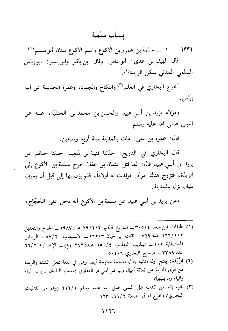 1332 - سَلمَة بن عَمْرو بن الْأَكْوَع وَاسم الْأَكْوَع سِنَان أَبُو مُسلم قَالَ الْهَيْثَم بن عدي أَبُو عَامر وَقَالَ بن بكير وَابْن نمير أَبُو إِيَاس السّلمِيّ الْمدنِي سكن الربذَة أخرج البُخَارِيّ فِي الْعلم وَالنِّكَاح وَالْجهَاد وَعمرَة الْحُدَيْبِيَة عَن أَبِيه إِيَاس ومولاه يزِيد بن أبي عبيد وَالْحسن بن مُحَمَّد بن الْحَنَفِيَّة عَنهُ عَن النَّبِي صلى الله عَلَيْهِ وَسلم قَالَ عَمْرو بن عَليّ مَاتَ بِالْمَدِينَةِ سنة أَربع وَسبعين قَالَ البُخَارِيّ فِي التَّارِيخ حَدثنَا قُتَيْبَة بن سعيد حَدثنَا حَاتِم عَن يزِيد بن أبي عبيد قَالَ لما قتل عُثْمَان بن عَفَّان خرج سَلمَة بن الْأَكْوَع الى الربذَة فَتزَوج هُنَاكَ امْرَأَة فَولدت لَهُ أَوْلَادًا فَلم يزل بهَا الى قبل أَن يَمُوت بِليَال نزل بِالْمَدِينَةِ وَعَن يزِيد بن أبي عبيد عَن سَلمَة بن الْأَكْوَع أَنه دخل عَليّ الْحجَّاج فَقَالَ يَا بن الْأَكْوَع ارتددت على عقبيك تعريت قَالَ لَا وَلَكِن رَسُول الله صلى الله عَلَيْهِ وَسلم أذن لي فِي البدو