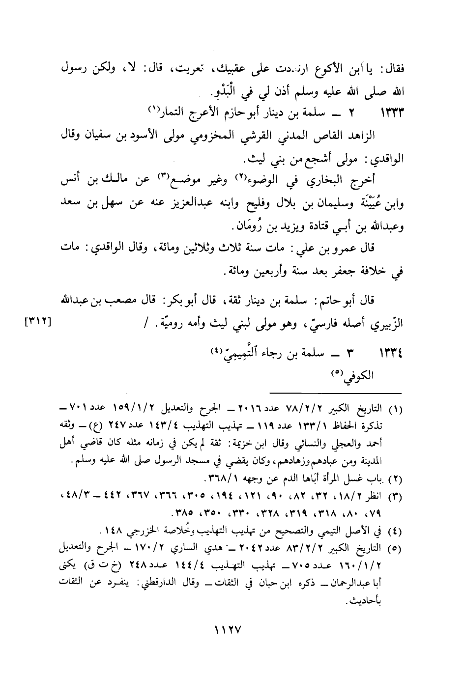1333 - سَلمَة بن دِينَار أَبُو حَازِم الْأَعْرَج التمار الزَّاهِد الْقَاص الْمدنِي الْقرشِي المَخْزُومِي مولى الْأسود بن سُفْيَان وَقَالَ الْوَاقِدِيّ مولى أَشْجَع من بني لَيْث أخرج البُخَارِيّ فِي الْوضُوء وَغير مَوضِع عَن مَالك بن أنس وَابْن عُيَيْنَة وَسليمَان بن بِلَال وفليح وَابْنه عبد الْعَزِيز عَنهُ عَن سهل بن سعد وَعبد الله بن أبي قَتَادَة وَيزِيد بن رُومَان قَالَ عَمْرو بن عَليّ مَاتَ سنة ثَلَاث وَثَلَاثِينَ وَمِائَة وَقَالَ الْوَاقِدِيّ مَاتَ فِي خلَافَة جَعْفَر بعد سنة وَأَرْبَعين وَمِائَة قَالَ أَبُو حَاتِم سَلمَة بن دِينَار ثِقَة قَالَ أَبُو بكر قَالَ مُصعب بن عبد الله الزبيرِي أَصله فَارسي وَهُوَ مولى لبني لَيْث وَأمه رُومِية