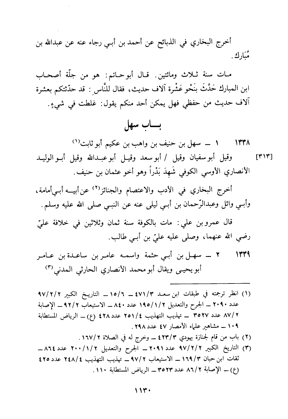 1338 - سهل بن حنيف بن واهب بن عكيم أَبُو ثَابت وَقيل أَبُو سُفْيَان وَقيل أَبُو سعد وَقيل أَبُو عبد الله وَقيل أَبُو الْوَلِيد الْأنْصَارِيّ الأوسي الْكُوفِي شهد بَدْرًا وَهُوَ أَخُو عُثْمَان بن حنيف أخرج البُخَارِيّ فِي الْأَدَب والاعتصام والجنائز عَن أَبِيه أبي أُمَامَة وَأبي وَائِل وَعبد الرَّحْمَن بن أبي ليلى عَنهُ عَن النَّبِي صلى الله عَلَيْهِ وَسلم قَالَ عَمْرو بن عَليّ مَاتَ بِالْكُوفَةِ سنة ثَمَان وَثَلَاثِينَ فِي خلَافَة عَليّ رَضِي الله عَنْهُمَا وَصلى عَلَيْهِ عَليّ بن أبي طَالب