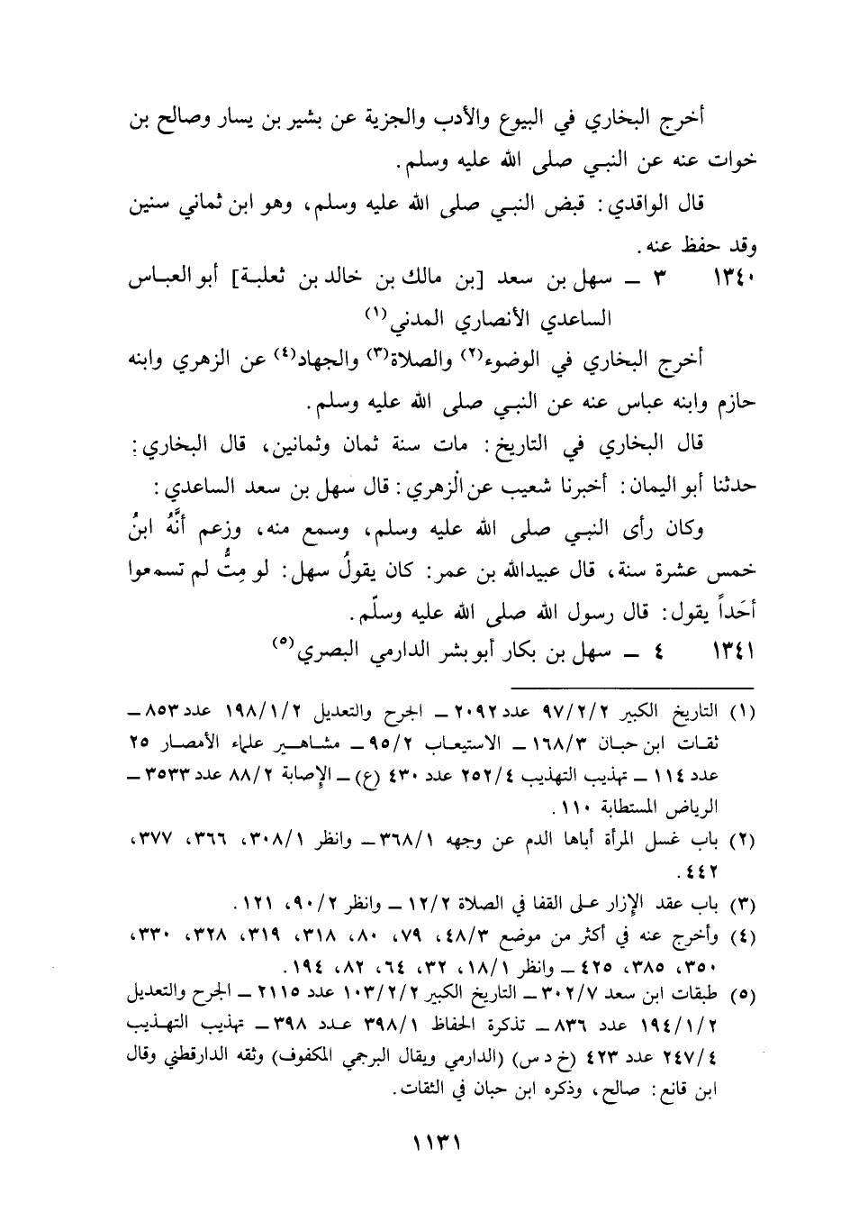 1340 - سهل بن سعد بن مَالك بن خَالِد بن ثَعْلَبَة أَبُو الْعَبَّاس السَّاعِدِيّ الْأنْصَارِيّ الْمدنِي أخرج البُخَارِيّ فِي الْوضُوء وَالصَّلَاة وَالْجهَاد عَن الزُّهْرِيّ وَابْنه حَازِم وَابْنه عَبَّاس عَنهُ عَن النَّبِي صلى الله عَلَيْهِ وَسلم قَالَ البُخَارِيّ فِي التَّارِيخ مَاتَ سنة ثَمَان وَثَمَانِينَ قَالَ البُخَارِيّ حَدثنَا أَبُو الْيَمَان أخبرنَا شُعَيْب عَن الزُّهْرِيّ قَالَ سهل بن سعد السَّاعِدِيّ وَكَانَ رَأْي النَّبِي صلى الله عَلَيْهِ وَسلم وَسمع مِنْهُ وَزعم أَنه بن خمس عشرَة سنة قَالَ عبيد الله بن عمر كَانَ يَقُول سهل لَو مت لم تسمعوا أحدا يَقُول قَالَ رَسُول الله صلى الله عَلَيْهِ وَسلم