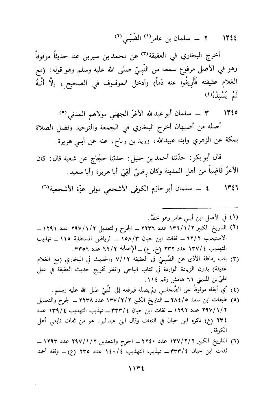 1344 - سلمَان بن عَامر الضَّبِّيّ أخرج البُخَارِيّ فِي الْعَقِيقَة عَن مُحَمَّد بن سِيرِين عَنهُ حَدِيثا مَوْقُوفا وَهُوَ فِي الأَصْل مَرْفُوع سَمعه من النَّبِي صلى الله عَلَيْهِ وَسلم وَهُوَ قَوْله مَعَ الْغُلَام عقيقته فأريقوا عَنهُ دَمًا وَأدْخل الْمَوْقُوف فِي الصَّحِيح إِلَّا أَنه لم يسْندهُ