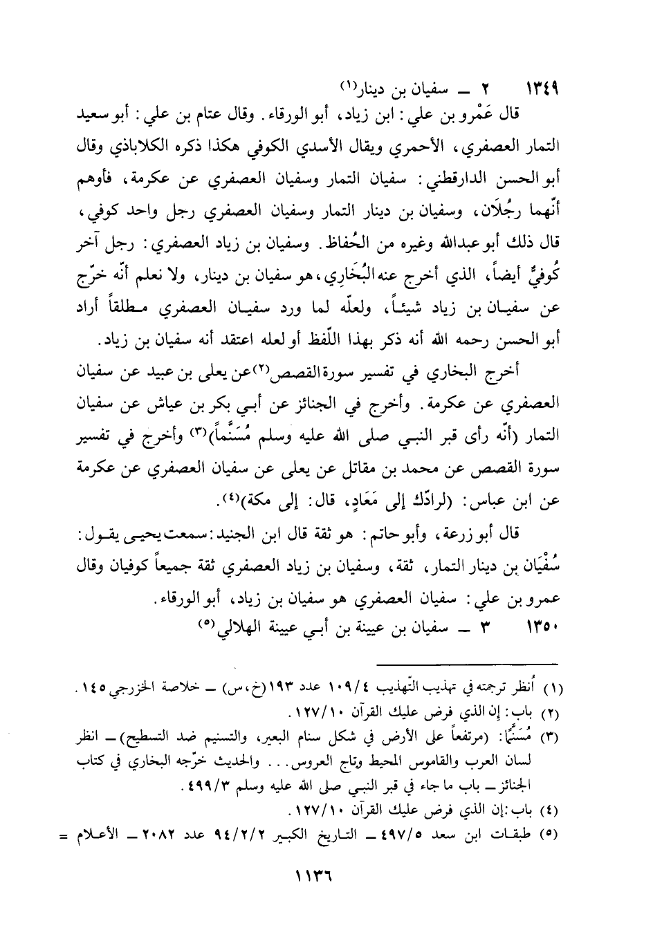 1349 - سُفْيَان بن دِينَار قَالَ عَمْرو بن عَليّ بن زِيَاد أَبُو الورقاء وَقَالَ عتام بن عَليّ أَبُو سعيد التمار الْعُصْفُرِي الأحمري وَيُقَال الْأَسدي الْكُوفِي هَكَذَا ذكره الكلاباذي وَقَالَ أَبُو الْحسن الدَّارَقُطْنِيّ سُفْيَان التمار وسُفْيَان الْعُصْفُرِي عَن عِكْرِمَة فأوهم أَنَّهُمَا رجلَانِ وسُفْيَان بن دِينَار التمار وسُفْيَان الْعُصْفُرِي رجل وَاحِد كُوفِي قَالَ ذَلِك أَبُو عبد الله وَغَيره من الْحفاظ وسُفْيَان بن زِيَاد الْعُصْفُرِي رجل آخر كُوفِي أَيْضا الَّذِي أخرج عَنهُ البُخَارِيّ هُوَ سُفْيَان بن دِينَار وَلَا نعلم أَنه خرج عَن سُفْيَان بن زِيَاد شَيْئا وَلَعَلَّه لما ورد سُفْيَان الْعُصْفُرِي مُطلقًا أَرَادَ أَبُو الْحسن رَحمَه الله أَنه ذكر بِهَذَا اللَّفْظ أَو لَعَلَّه اعْتقد أَنه سُفْيَان بن زِيَاد أخرج البُخَارِيّ فِي تَفْسِير سُورَة الْقَصَص عَن يعلى بن عبيد عَن سُفْيَان الْعُصْفُرِي عَن عِكْرِمَة وَأخرج فِي الْجَنَائِز عَن أبي بكر بن عَيَّاش عَن سُفْيَان التمار أَنه رأى قبر النَّبِي صلى الله عَلَيْهِ وَسلم مسنما وَأخرج فِي تَفْسِير سُورَة الْقَصَص عَن مُحَمَّد بن مقَاتل عَن يعلى عَن سُفْيَان الْعُصْفُرِي عَن عِكْرِمَة عَن بن عَبَّاس لرادك إِلَى معاد قَالَ إِلَى مَكَّة قَالَ أَبُو زرْعَة وَأَبُو حَاتِم هُوَ ثِقَة قَالَ بن الْجُنَيْد سَمِعت يحيى يَقُول سُفْيَان بن دِينَار التمار ثِقَة وسُفْيَان بن زِيَاد الْعُصْفُرِي ثِقَة جَمِيعًا كوفيان وَقَالَ عَمْرو بن عَليّ سُفْيَان الْعُصْفُرِي هُوَ سُفْيَان بن زِيَاد أَبُو الورقاء