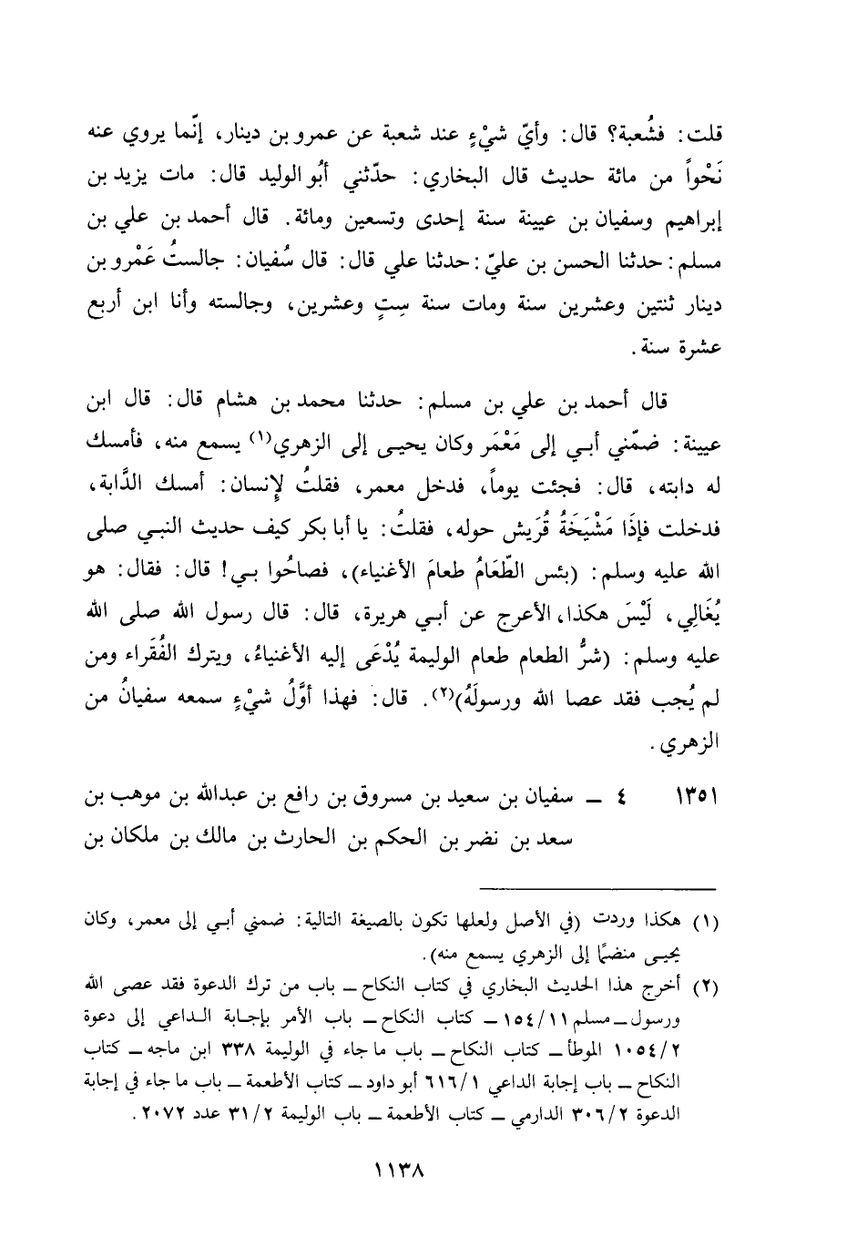 1351 - سُفْيَان بن سعيد بن مَسْرُوق بن رَافع بن عبد الله بن موهب بن سعد بن نضر بن الحكم بن الْحَارِث بن مَالك بن ملكان بن