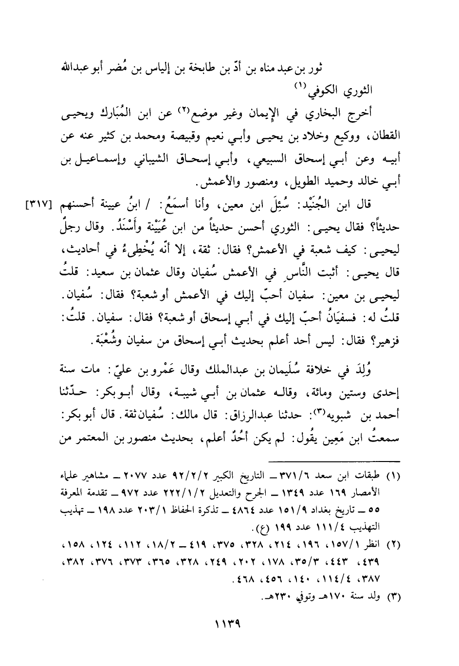 ثَوْر بن عبد مناه بن أد بن طابخة بن إلْيَاس بن مُضر أَبُو عبد الله الثَّوْريّ الْكُوفِي أخرج البُخَارِيّ فِي الْإِيمَان وَغير مَوضِع عَن بن الْمُبَارك وَيحيى الْقطَّان ووكيع وخلاد بن يحيى وَأبي نعيم وَقبيصَة وَمُحَمّد بن كثير عَنهُ عَن أَبِيه وَعَن أبي إِسْحَاق السبيعِي وَأبي إِسْحَاق الشَّيْبَانِيّ وَإِسْمَاعِيل بن أبي خَالِد وَحميد الطَّوِيل وَمَنْصُور وَالْأَعْمَش قَالَ بن الْجُنَيْد سُئِلَ بن معِين وَأَنا أسمع بن عُيَيْنَة أحْسنهم حَدِيثا فَقَالَ يحيى الثَّوْريّ أحسن حَدِيثا من بن عُيَيْنَة وَأسْندَ وَقَالَ رجل ليحيى كَيفَ شُعْبَة فِي الْأَعْمَش فَقَالَ ثِقَة إِلَّا أَنه يخطىء فِي أَحَادِيث قَالَ يحيى أثبت النَّاس فِي الْأَعْمَش سُفْيَان وَقَالَ عُثْمَان بن سعيد قلت ليحيى بن معِين سُفْيَان أحب إِلَيْك فِي الْأَعْمَش أَو شُعْبَة فَقَالَ سُفْيَان قلت لَهُ فسفيان أحب إِلَيْك فِي أبي إِسْحَاق أَو شُعْبَة فَقَالَ سُفْيَان قلت فزهير فَقَالَ لَيْسَ أحد أعلم بِحَدِيث أبي إِسْحَاق من سُفْيَان وَشعْبَة ولد فِي خلَافَة سُلَيْمَان بن عبد الْملك وَقَالَ عَمْرو بن عَليّ مَاتَ سنة إِحْدَى وَسِتِّينَ وَمِائَة وَقَالَهُ عُثْمَان بن أبي شيبَة وَقَالَ أَبُو بكر حَدثنَا أَحْمد بن شبوية حَدثنَا عبد الرَّزَّاق قَالَ مَالك سُفْيَان ثِقَة قَالَ أَبُو بكر سَمِعت بن معِين يَقُول لم يكن أحد أعلم بِحَدِيث مَنْصُور بن الْمُعْتَمِر من سُفْيَان الثَّوْريّ قَالَ أَبُو بكر حَدثنَا الْوَلِيد بن شُجَاع حَدثنَا الْمُبَارك بن سعيد قَالَ رَأَيْت عَاصِم بن أبي النجُود جَاءَ إِلَى سُفْيَان الثَّوْريّ يستفتيه وَيَقُول يَا سُفْيَان أَتَيْتنَا صَغِيرا وأتيناك كَبِيرا حَدثنَا أَبُو سَلمَة مُوسَى بن إِسْمَاعِيل حَدثنَا بن الْمُبَارك حَدثنَا سُفْيَان الثَّوْريّ بِحَدِيث فَجئْت وَهُوَ يحدثه فَلَمَّا رَآنِي استحيا وَقَالَ نرويه عَنْك