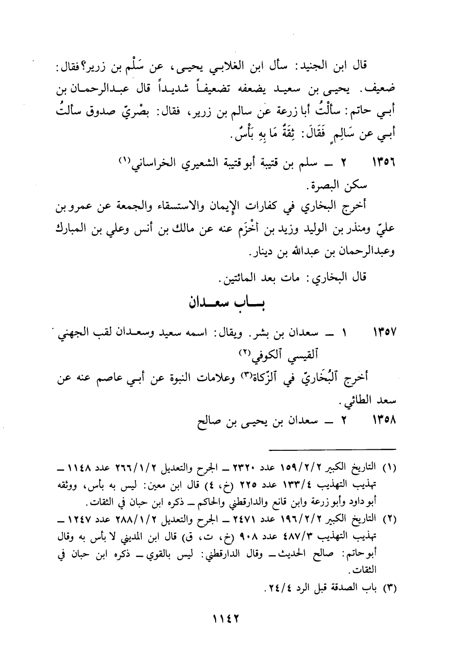 1358 - سَعْدَان بن يحيى بن صَالح وَيُقَال أَن اسْمه سعيد ولقبه سَعْدَان أَبُو يحيى اللَّخْمِيّ الْكُوفِي سكن دمشق أخرج البُخَارِيّ فِي غَزْوَة الْفَتْح عَن سُلَيْمَان بن عبد الرَّحْمَن عَنهُ عَن مُحَمَّد بن أبي حَفْصَة