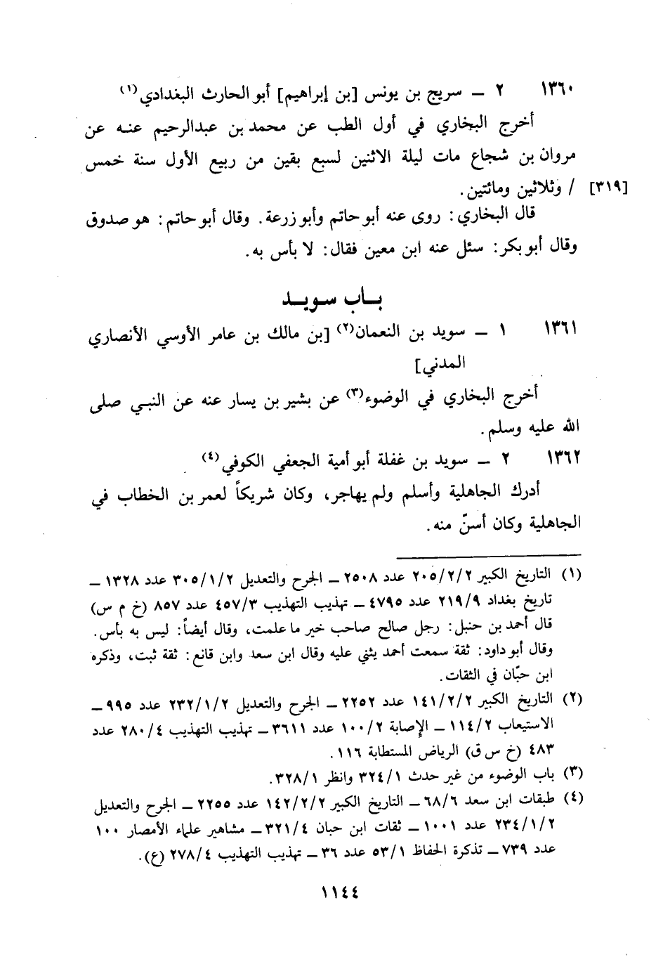 1362 - سُوَيْد بن غَفلَة أَبُو أُميَّة الْجعْفِيّ الْكُوفِي أدْرك الْجَاهِلِيَّة وَأسلم وَلم يُهَاجر وَكَانَ شَرِيكا لعمر بن الْخطاب فِي الْجَاهِلِيَّة وَكَانَ أسن مِنْهُ أخرج البُخَارِيّ فِي اللّقطَة وفضائل الْقُرْآن وَصفَة النَّبِي صلى الله عَلَيْهِ وَسلم وقتال الْخَوَارِج عَن خَيْثَمَة بن عبد الرَّحْمَن وَسَلَمَة بن كهيل عَنهُ عَن عَليّ بن أبي طَالب وَأبي بن كَعْب قَالَ البُخَارِيّ فِي التَّارِيخ قَالَ أَبُو نعيم مَاتَ سنة سِتّ وَسبعين قَالَ البُخَارِيّ فِي التَّارِيخ وَحدثنَا أَحْمد بن أبي الطّيب حَدثنَا عبد السَّلَام بن حَرْب عَن زِيَاد بن خَيْثَمَة من عَامر الشّعبِيّ قَالَ سُوَيْد بن غَفلَة أَنا أَصْغَر من النَّبِي صلى الله عَلَيْهِ وَسلم بِسنتَيْنِ قَالَ أَحْمد بن عَليّ بن مُسلم مَاتَ وَله مائَة سنة وَعِشْرُونَ سنة قَالَ أَحْمد بن عَليّ بن مُسلم حَدثنَا تَمِيم بن الْمُنْتَصر حَدثنَا إِسْحَاق بن يُوسُف الْأَزْرَق عَن عُثْمَان بن أبي زرْعَة عَن أبي ليلى الْكِنْدِيّ عَن سُوَيْد بن غَفلَة قَالَ أَتَانَا رَسُول الله صلى الله عَلَيْهِ وَسلم مُصدقا فَأخذت بِيَدِهِ قَالَ عَمْرو بن عَليّ سَمِعت عبد الله بن دَاوُد يَقُول سَمِعت عَليّ بن صَالح يَقُول بلغ سُوَيْد بن غَفلَة عشْرين وَمِائَة سنة لم ير مُحْتَبِيًا قطّ وَلَا متساندا قطّ وَأصَاب بكرا قَالَ أَبُو دَاوُد يَعْنِي فِي الْعَام الَّذِي توفّي فِيهِ