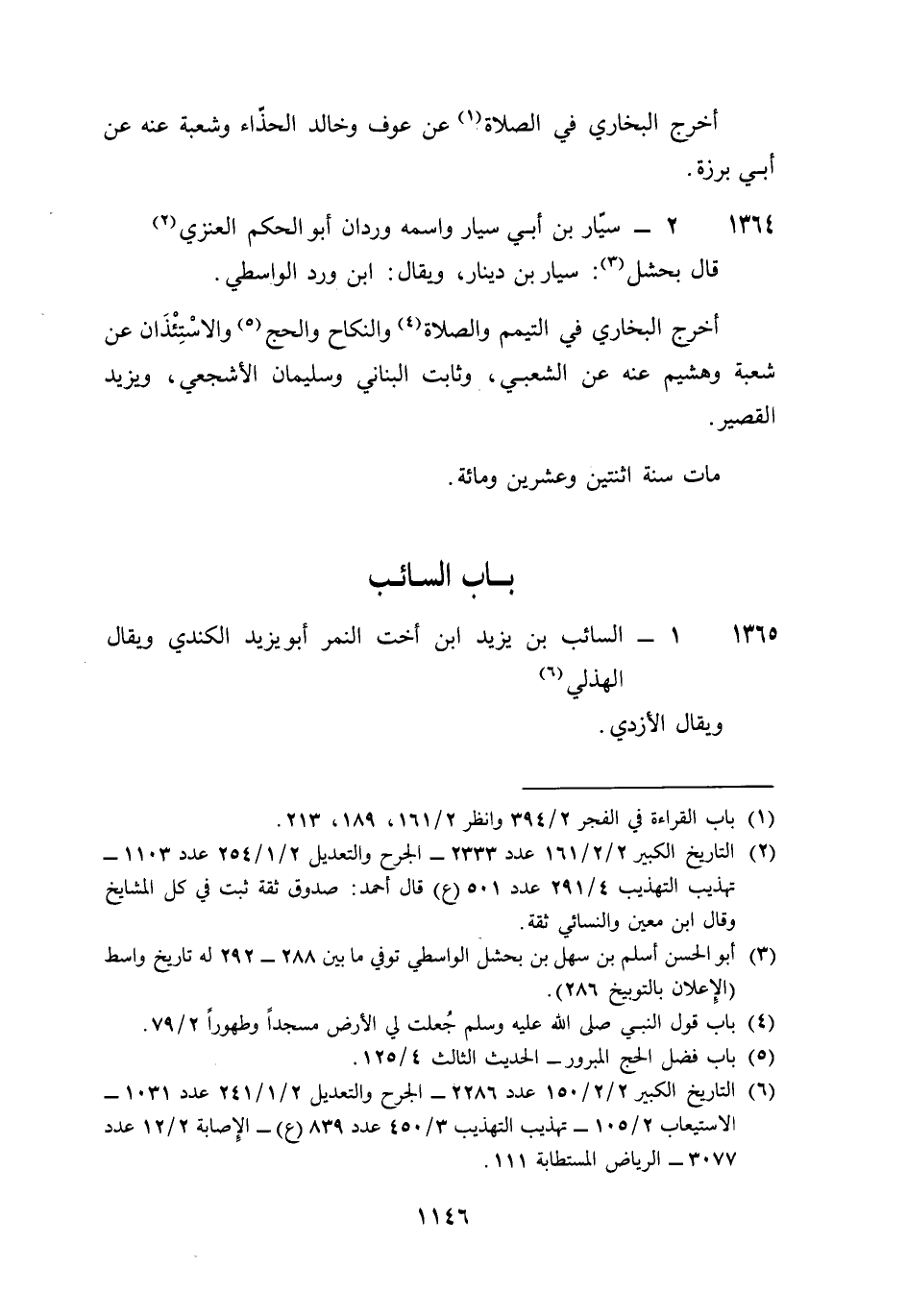 1365 - السَّائِب بن يزِيد بن أُخْت النمر أَبُو يزِيد الْكِنْدِيّ وَيُقَال الْهُذلِيّ وَيُقَال الْأَزْدِيّ أخرج البُخَارِيّ فِي الْوضُوء وَالْجُمُعَة وَغير مَوضِع عَن الزُّهْرِيّ وَمُحَمّد بن يُوسُف وَيزِيد بن حَصِيفَةَ وجعيد بن عبد الرَّحْمَن عَنهُ عَن النَّبِي صلى الله عَلَيْهِ وَسلم وَعَن عُثْمَان بن عَفَّان وسُفْيَان بن أبي زُهَيْر والْعَلَاء بن الْحَضْرَمِيّ وَحُوَيْطِب بن عبد الْعُزَّى قَالَ البُخَارِيّ فِي التَّارِيخ حَدثنِي عبد الرَّحْمَن بن يُوسُف حَدثنَا حَاتِم عَن مُحَمَّد بن يُوسُف عَن بن يزِيد قَالَ حج أبي مَعَ النَّبِي صلى الله عَلَيْهِ وَسلم فِي حجَّة الْوَدَاع وَأَنا بن سبع قَالَ عَمْرو بن عَليّ مَاتَ سنة إِحْدَى وَتِسْعين وَهُوَ بن ثَمَان وَثَمَانِينَ وَقَالَ البُخَارِيّ حَدثنَا عَليّ بن عبد الله حَدثنَا سُفْيَان سَمِعت الزُّهْرِيّ سَمِعت السايب بن يزِيد يَقُول أذكر أَنِّي خرجت مَعَ الغلمان إِلَى ثنية الْوَدَاع نتلقى رَسُول الله صلى الله عَلَيْهِ وَسلم