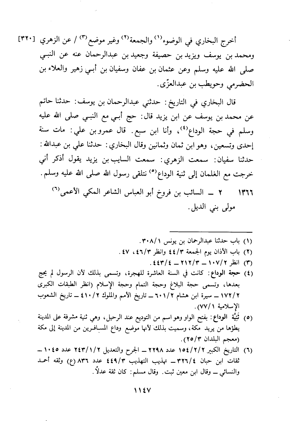 1366 - السَّائِب بن فروخ أَبُو الْعَبَّاس الشَّاعِر الْمَكِّيّ الْأَعْمَى مولى بني الديل أخرج البُخَارِيّ فِي الصَّوْم والتوحيد وغزوة الطَّائِف وَالْأَدب وَغير مَوضِع عَن حبيب بن أبي ثَابت وَعَمْرو بن دِينَار وَعَطَاء بن أبي رَبَاح عَنهُ عَن عبد الله بن عمر وَعبد الله بن عَمْرو قَالَ أَبُو بكر سَأَلت عَنهُ يحيى بن معِين فَقَالَ مكي ثِقَة