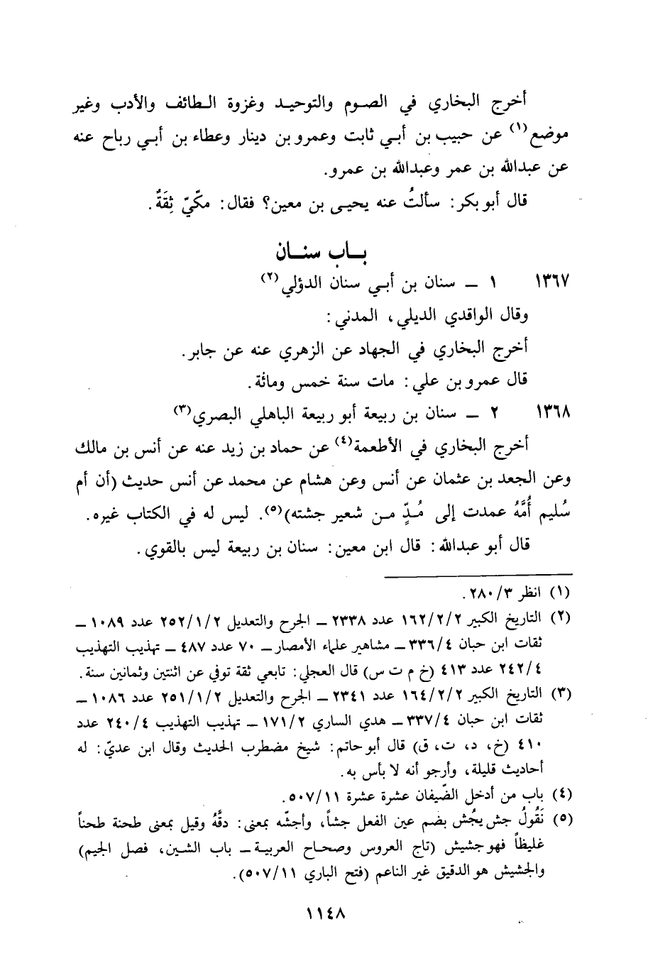 1368 - سِنَان بن ربيعَة أَبُو ربيعَة الْبَاهِلِيّ الْبَصْرِيّ أخرج البُخَارِيّ فِي الْأَطْعِمَة عَن حَمَّاد بن زيد عَنهُ عَن أنس بن مَالك وَعَن الْجَعْد بن عُثْمَان عَن أنس وَعَن هِشَام عَن مُحَمَّد عَن أنس حَدِيث أَن أم سليم أمه عَمَدت إِلَى مد من شعير جشته لَيْسَ لَهُ فِي الْكتاب غَيره قَالَ أَبُو عبد الله قَالَ بن معِين سِنَان بن ربيعَة لَيْسَ بِالْقَوِيّ