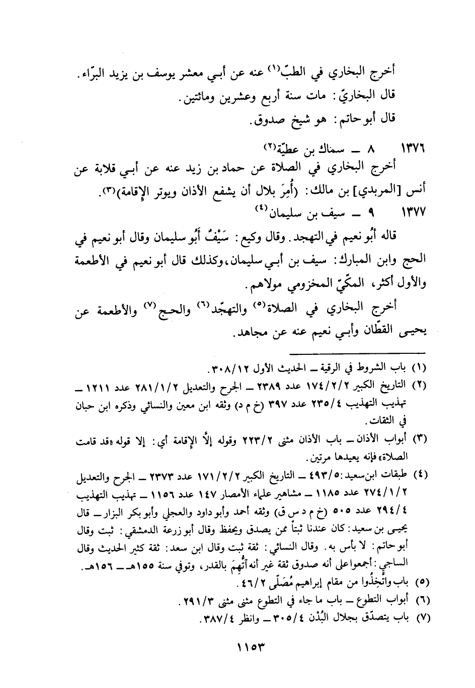 1377 - سيف بن سُلَيْمَان قَالَه أَبُو نعيم فِي التَّهَجُّد وَقَالَ وَكِيع سيف أَبُو سُلَيْمَان وَقَالَ أَبُو نعيم فِي الْحَج وَابْن الْمُبَارك سيف بن أبي سُلَيْمَان وَكَذَلِكَ قَالَ أَبُو نعيم فِي الْأَطْعِمَة وَالْأول أَكثر الْمَكِّيّ المَخْزُومِي مَوْلَاهُم أخرج البُخَارِيّ فِي الصَّلَاة والتهجد وَالْحج والأطعمة عَن يحيى الْقطَّان وَأبي نعيم عَنهُ عَن مُجَاهِد قَالَ البُخَارِيّ قَالَ يحيى الْقطَّان كَانَ سيف بن سُلَيْمَان حَيا سنة خمسين وَمِائَة وَكَانَ عندنَا ثِقَة مِمَّن يصدق ويحفظ قَالَ أَبُو حَاتِم لَا بَأْس بِهِ