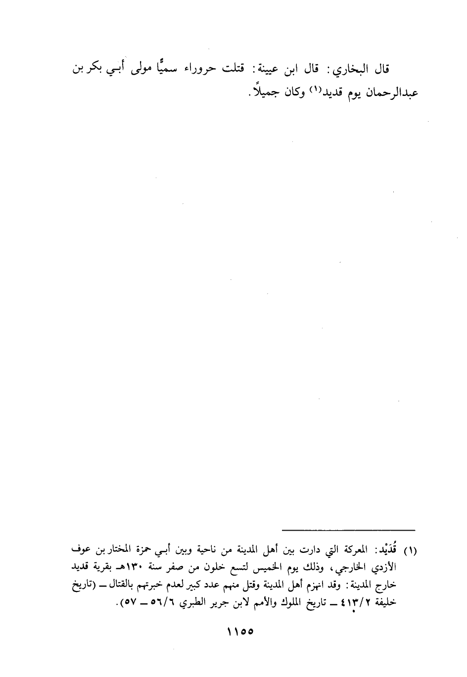 قَالَ البُخَارِيّ قَالَ بن عُيَيْنَة قتلت حروراء سميا مولى أبي بكر بن عبد الرَّحْمَن يَوْم قديد وَكَانَ جميلا