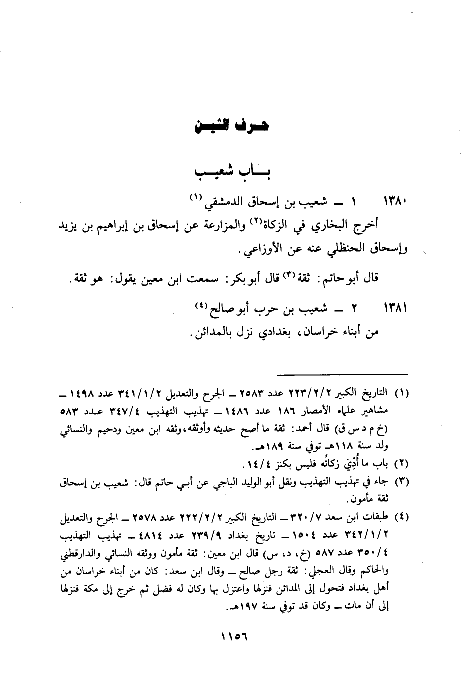 1380 - شُعَيْب بن إِسْحَاق الدِّمَشْقِي أخرج البُخَارِيّ فِي الزَّكَاة والمزارعة عَن إِسْحَاق بن إِبْرَاهِيم بن يزِيد وَإِسْحَاق الْحَنْظَلِي عَنهُ عَن الْأَوْزَاعِيّ قَالَ أَبُو حَاتِم ثِقَة قَالَ أَبُو بكر سَمِعت بن معِين يَقُول هُوَ ثِقَة