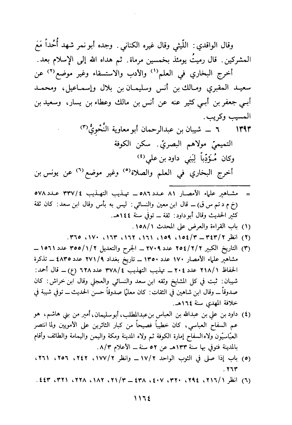 1393 - شَيبَان بن عبد الرَّحْمَن أَبُو مُعَاوِيَة النَّحْوِيّ التَّمِيمِي مَوْلَاهُم الْبَصْرِيّ سكن الْكُوفَة وَكَانَ مؤدبا لبني دَاوُد بن عَليّ أخرج البُخَارِيّ فِي الْعلم وَالصَّلَاة وَغير مَوضِع عَن يُونُس بن مُحَمَّد وحسين المروروذي وَسعد بن حَفْص وَأبي النَّضر وَأبي نعيم وآدَم بن أبي إِيَاس وَغَيرهم عَنهُ عَن قَتَادَة وَيحيى بن أبي كثير وَزِيَاد بن علاقَة توفّي بِبَغْدَاد سنة أَربع وَسِتِّينَ وَمِائَة قَالَ أَبُو حَاتِم هُوَ كُوفِي حسن الحَدِيث صَالح الحَدِيث وَيكْتب حَدِيثه قَالَ بن الْجُنَيْد سَمِعت يحيى يَقُول شَيبَان أحب إِلَيّ من حَرْب بن شَدَّاد وَيحيى بن أبي كثير قَالَ أَبُو بكر سَمِعت يحيى بن معِين يَقُول شَيبَان ثِقَة وَكَانَ صَاحب كتاب وَهُوَ رجل صَالح يُقَال إِنَّه مَاتَ بِبَغْدَاد فِي خلَافَة الْمهْدي وَدفن فِي مَقَابِر الخيزران