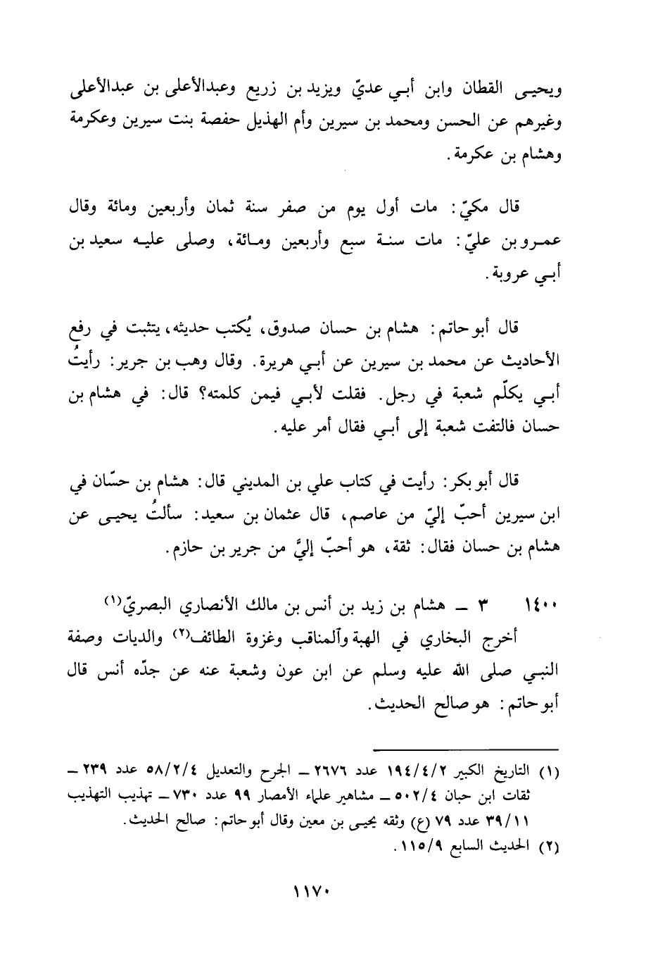 1400 - هِشَام بن زيد بن أنس بن مَالك الْأنْصَارِيّ الْبَصْرِيّ أخرج البُخَارِيّ فِي الْهِبَة والمناقب وغزوة الطَّائِف والديات وَصفَة النَّبِي صلى الله عَلَيْهِ وَسلم عَن بن عون وَشعْبَة عَنهُ عَن جده أنس قَالَ أَبُو حَاتِم هُوَ صَالح الحَدِيث