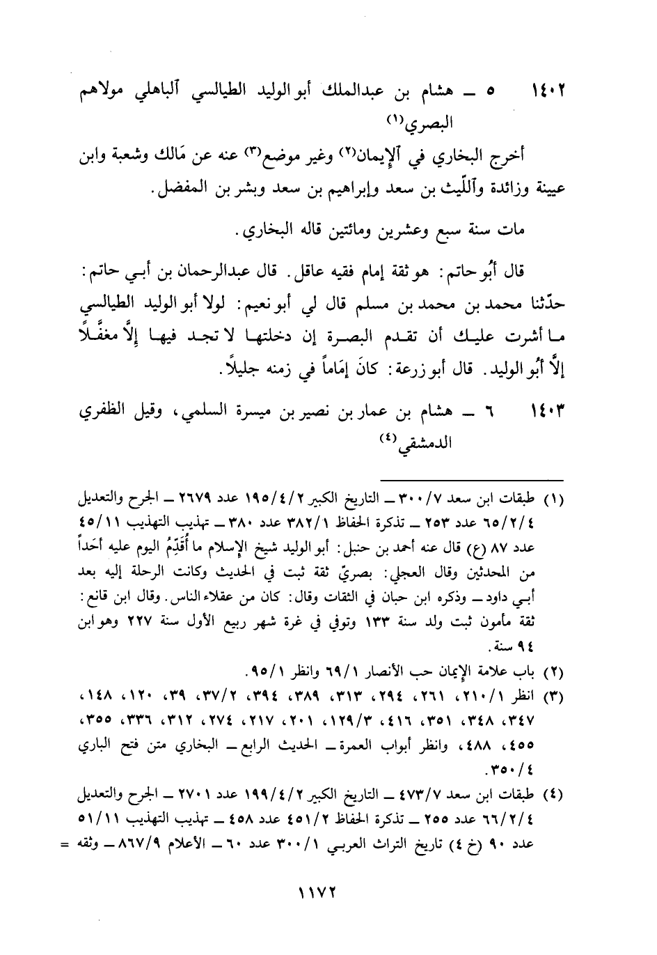 1402 - هِشَام بن عبد الْملك أَبُو الْوَلِيد الطَّيَالِسِيّ الْبَاهِلِيّ مَوْلَاهُم الْبَصْرِيّ أخرج البُخَارِيّ فِي الْإِيمَان وَغير مَوضِع عَنهُ عَن مَالك وَشعْبَة وَابْن عُيَيْنَة وزائدة وَاللَّيْث بن سعد وَإِبْرَاهِيم بن سعد وَبشر بن الْمفضل مَاتَ سنة سبع وَعشْرين وَمِائَتَيْنِ قَالَه البُخَارِيّ قَالَ أَبُو حَاتِم هُوَ ثِقَة إِمَام فَقِيه عَاقل قَالَ عبد الرَّحْمَن بن أبي حَاتِم حَدثنَا مُحَمَّد بن مُحَمَّد بن مُسلم قَالَ لي أَبُو نعيم لَوْلَا أَبُو الْوَلِيد الطَّيَالِسِيّ مَا أَشرت عَلَيْك أَن تقدم الْبَصْرَة إِن دَخَلتهَا لَا تَجِد فِيهَا إِلَّا مغفلا إِلَّا أَبُو الْوَلِيد قَالَ أَبُو زرْعَة كَانَ إِمَامًا فِي زَمَنه جَلِيلًا