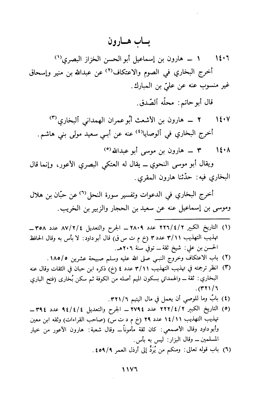 1406 - هَارُون بن إِسْمَاعِيل أَبُو الْحسن الخزاز الْبَصْرِيّ أخرج البُخَارِيّ فِي الصَّوْم والإعتكاف عَن عبد الله بن مُنِير وَإِسْحَاق غير مَنْسُوب عَنهُ عَن عَليّ بن الْمُبَارك قَالَ أَبُو حَاتِم مَحَله الصدْق