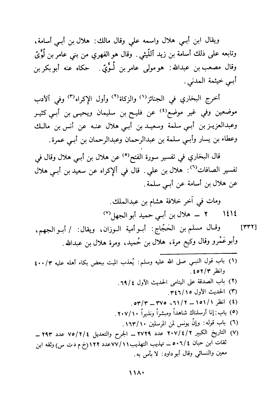 1414 - هِلَال بن أبي حميد أَبُو الْجَهْل وَقَالَ مُسلم بن الْحجَّاج أَبُو أُميَّة الْوزان وَيُقَال أَبُو الجهم وَأَبُو عَمْرو وَقَالَ وَكِيع مرّة هِلَال بن حميد وَمرَّة هِلَال بن عبد الله أخرج البُخَارِيّ فِي الرقَاق والجنائز والمغازي عَن مسعر وشيبان وَأَبُو عوَانَة عَنهُ عَن عُرْوَة بن الزبير