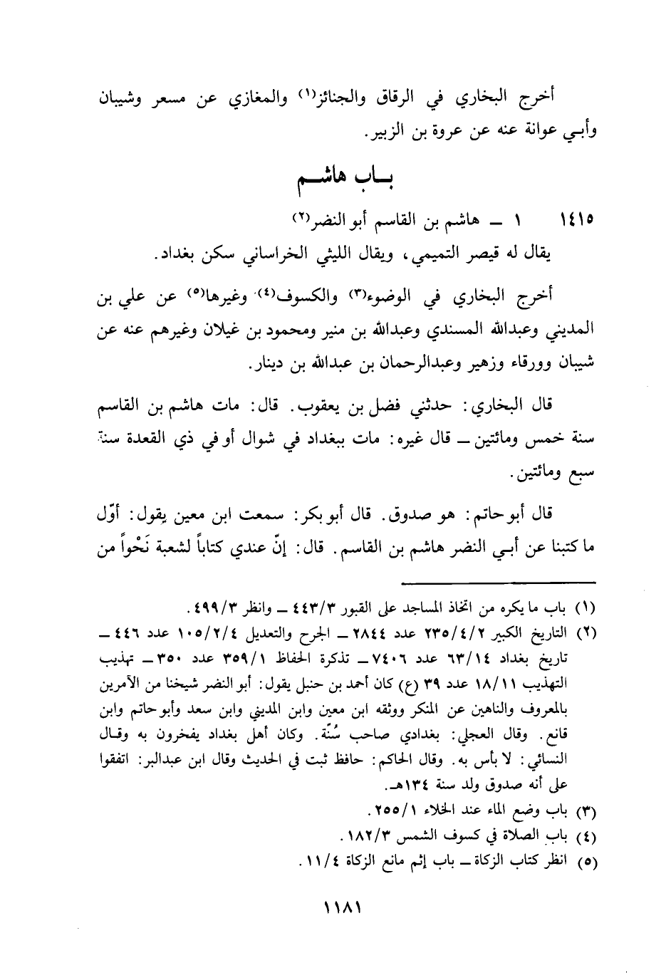 1415 - هَاشم بن الْقَاسِم أَبُو النَّضر يُقَال لَهُ قَيْصر التَّمِيمِي وَيُقَال اللَّيْثِيّ الْخُرَاسَانِي سكن بَغْدَاد أخرج البُخَارِيّ فِي الْوضُوء والكسوف وَغَيرهَا عَن عَليّ بن الْمَدِينِيّ وَعبد الله المسندي وَعبد الله بن مُنِير ومحمود بن غيلَان وَغَيرهم عَنهُ عَن شَيبَان وورقاء وَزُهَيْر وَعبد الرَّحْمَن بن عبد الله بن دِينَار قَالَ البُخَارِيّ حَدثنِي فضل بن يَعْقُوب قَالَ مَاتَ هَاشم بن الْقَاسِم سنة خمس وَمِائَتَيْنِ قَالَ غَيره مَاتَ بِبَغْدَاد فِي شَوَّال أَو فِي ذِي الْقعدَة سنة سبع وَمِائَتَيْنِ قَالَ أَبُو حَاتِم هُوَ صَدُوق قَالَ أَبُو بكر سَمِعت بن معِين يَقُول أول مَا كتبنَا عَن أبي النَّضر هَاشم بن الْقَاسِم قَالَ إِن عِنْدِي كتابا لشعبة نَحوا من ثَمَانِي مائَة حَدِيث سَأَلت عَنْهَا شُعْبَة فحدثنا بهَا وَعِنْدِي غير هَذِه لست اجترىء عَلَيْهَا ثمَّ حضرناه من بعد ذَلِك يَقُول فِي تِلْكَ الْأَحَادِيث الْبَاقِيَة حَدثنَا شُعْبَة والْحَدِيث فتْنَة وَكَانَ نَحوا من أَرْبَعَة آلَاف كَذَا قَالَ يحيى