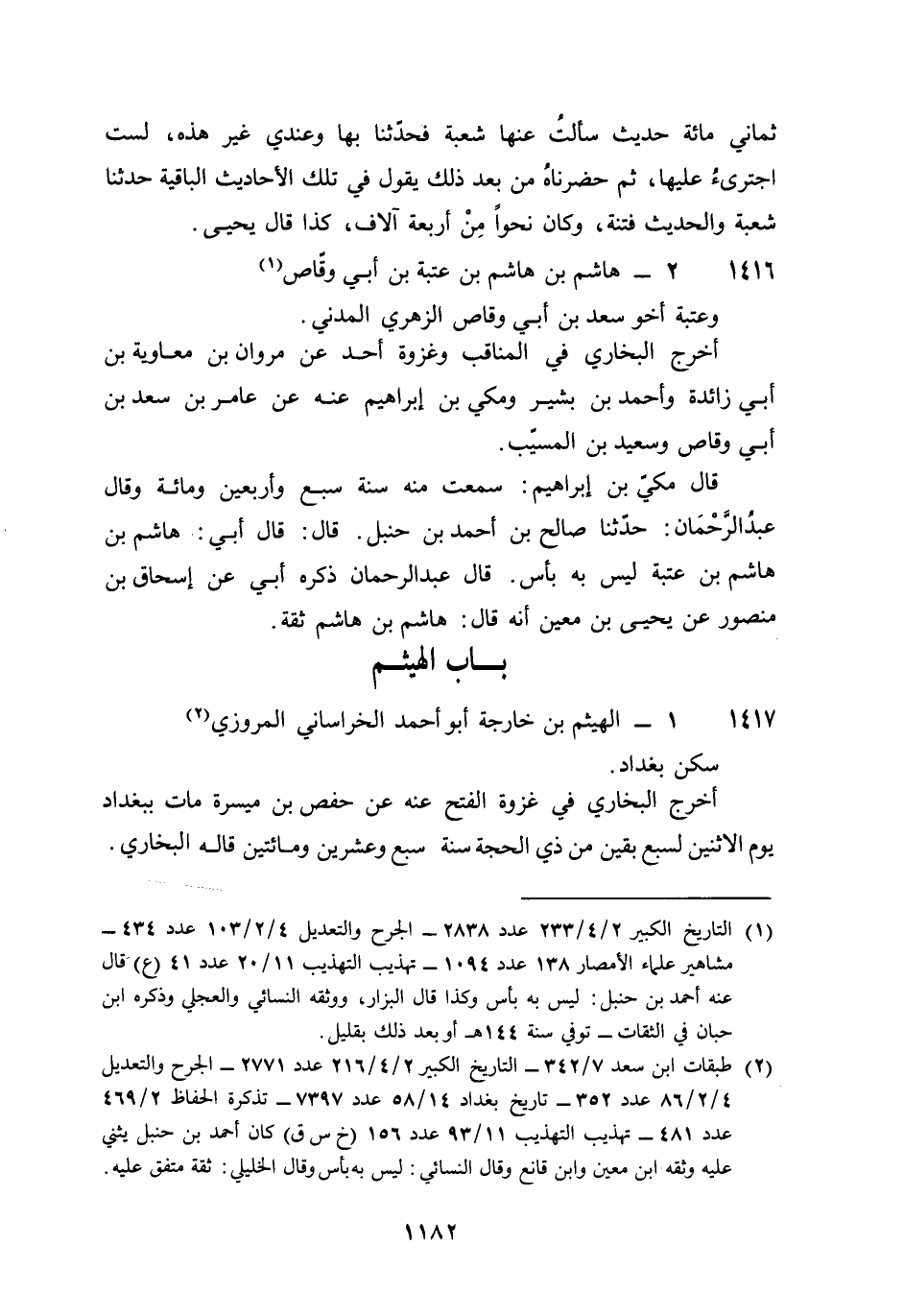 1416 - هَاشم بن هَاشم بن عتبَة بن أبي وَقاص وَعتبَة أَخُو سعد بن أبي وَقاص الزُّهْرِيّ الْمدنِي أخرج البُخَارِيّ فِي المناقب وغزوة أحد عَن مَرْوَان بن مُعَاوِيَة بن أبي زَائِدَة وَأحمد بن بشير ومكي بن إِبْرَاهِيم عَنهُ عَن عَامر بن سعد بن أبي وَقاص وَسَعِيد بن الْمسيب قَالَ مكي بن إِبْرَاهِيم سَمِعت مِنْهُ سنة سبع وَأَرْبَعين وَمِائَة وَقَالَ عبد الرَّحْمَن حَدثنَا صَالح بن أَحْمد بن حَنْبَل قَالَ قَالَ أبي هَاشم بن هَاشم بن عتبَة لَيْسَ بِهِ بَأْس قَالَ عبد الرَّحْمَن ذكره أبي عَن إِسْحَاق بن مَنْصُور عَن يحيى بن معِين أَنه قَالَ هَاشم بن هَاشم ثِقَة