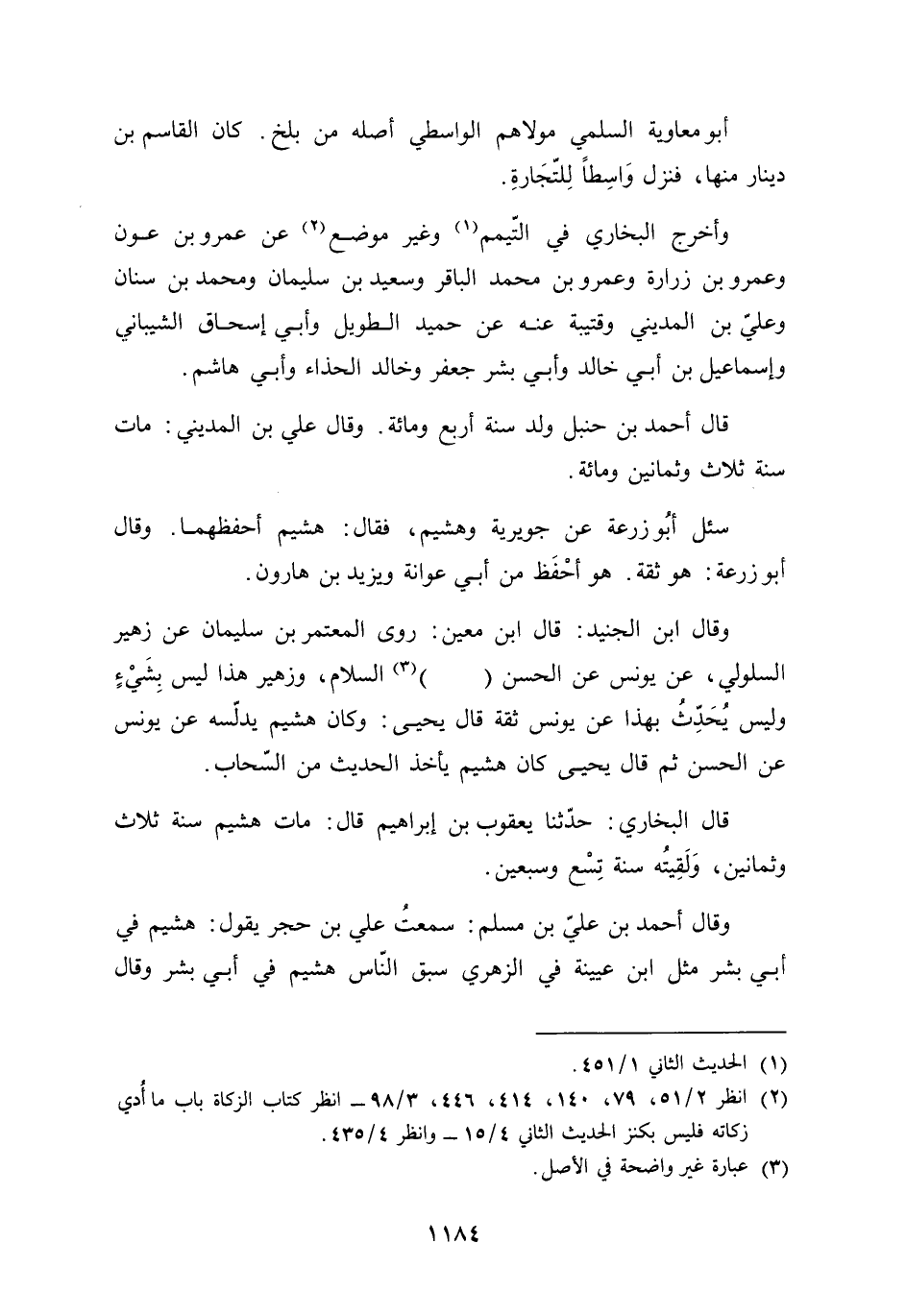أَبُو مُعَاوِيَة السّلمِيّ مَوْلَاهُم الوَاسِطِيّ أَصله من بَلخ كَانَ الْقَاسِم بن دِينَار مِنْهَا فَنزل واسطا للتِّجَارَة وَأخرج البُخَارِيّ فِي التَّيَمُّم وَغير مَوضِع عَن عَمْرو بن عون وَعمر بن زُرَارَة وَعَمْرو بن مُحَمَّد الباقر وَسَعِيد بن سُلَيْمَان وَمُحَمّد بن سِنَان وَعلي بن الْمَدِينِيّ وقتيبة عَنهُ عَن حميد الطَّوِيل وَأبي إِسْحَاق الشَّيْبَانِيّ وَإِسْمَاعِيل بن أبي خَالِد وَأبي بشر جَعْفَر وخَالِد الْحذاء وَأبي هَاشم قَالَ أَحْمد بن حَنْبَل ولد سنة أَربع وَمِائَة وَقَالَ عَليّ بن الْمَدِينِيّ مَاتَ سنة ثَلَاث وَثَمَانِينَ وَمِائَة سُئِلَ أَبُو زرْعَة عَن جوَيْرِية وهشيم فَقَالَ هشيم أحفظها وَقَالَ أَبُو زرْعَة هُوَ ثِقَة هُوَ أحفظ من أبي عوَانَة وَيزِيد بن هَارُون وَقَالَ بن الْجُنَيْد قَالَ بن معِين روى الْمُعْتَمِر بن سُلَيْمَان عَن زُهَيْر السَّلُولي عَن يُونُس عَن الْحسن السَّلَام وَزُهَيْر هَذَا لَيْسَ بِشَيْء وَلَيْسَ يحدث بِهَذَا عَن يُونُس ثِقَة قَالَ يحيى وَكَانَ هشيم يدلسه عَن يُونُس عَن الْحسن ثمَّ قَالَ يحيى كَانَ هشيم يَأْخُذ الحَدِيث من السَّحَاب قَالَ البُخَارِيّ حَدثنَا يَعْقُوب بن إِبْرَاهِيم قَالَ مَاتَ هشيم سنة ثَلَاث وَثَمَانِينَ ولقيته سنة تسع وَتِسْعين وَقَالَ أَحْمد بن عَليّ بن مُسلم سَمِعت عَليّ بن حجر يَقُول هشيم فِي أبي بشر مثل بن عُيَيْنَة فِي الزُّهْرِيّ سبق النَّاس هشيم فِي أبي بشر وَقَالَ