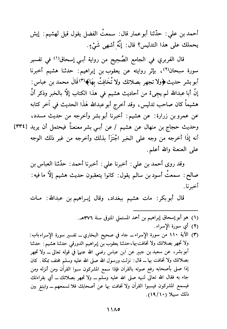 أَحْمد بن عَليّ حَدثنَا أَبُو عمار قَالَ سَمِعت الْفضل يَقُول قيل لهشيم إيش يحملك على هَذَا التَّدْلِيس قَالَ إِنَّه أشهى شَيْء قَالَ الْفربرِي فِي الْجَامِع الصَّحِيح من رِوَايَة أبي إِسْحَاق فِي تَفْسِير سُورَة سُبْحَانَ بإثر رِوَايَته عَن يَعْقُوب بن إِبْرَاهِيم حَدثنَا هشيم أخبرنَا أَبُو بشر حَدِيث وَلَا تجْهر بصلاتك وَلَا تخَافت بهَا قَالَ مُحَمَّد بن عَبَّاس إِن أَبَا عبد الله لم يجىء من أَحَادِيث هشيم فِي هَذَا الْكتاب إِلَّا بالْخبر وَذكر أَن هشيما كَانَ صَاحب تَدْلِيس وَقد أخرج أَبُو عبد الله هَذَا الحَدِيث فِي آخر كِتَابه عَن عَمْرو بن زُرَارَة عَن هشيم أخبرنَا أَبُو بشر وَأخرجه من حَدِيث مُسَدّد وَحَدِيث حجاج بن منهال عَن هشيم عَن أبي بشر مُعَنْعنًا فَيحْتَمل أَن يُرِيد أَنه إِذا أخرجه من وَجه على الْخَبَر اجتزأ بذلك وَأخرجه من غير ذَلِك الْوَجْه على العنعنة وَالله أعلم وَقد روى أَحْمد بن عَليّ أخبرنَا عَليّ أخبرنَا أَحْمد حَدثنَا الْعَبَّاس بن صَالح سَمِعت أسود بن سَالم يَقُول كَانُوا يتعقبون حَدِيث هشيم إِلَّا مَا فِيهِ أخبرنَا قَالَ أَبُو بكر مَاتَ هشيم بِبَغْدَاد وَقَالَ إِبْرَاهِيم بن عبد الله مَاتَ هشيم يَوْم الْأَرْبَعَاء لعشر بَقينَ من شعْبَان سنة ثَلَاث وَثَمَانِينَ وَمَات بن علية بعده بِعشر سِنِين وَأشهر وَقَالَ إِبْرَاهِيم بن عبد الله لم يسمع هشيم من الزُّهْرِيّ إِلَّا أَرْبَعَة أَحَادِيث حَدِيث السَّقِيفَة وَحَدِيث المضامين والملاقيح وَحَدِيث مَا اسْتَيْسَرَ من الْهَدْي وَحَدِيث أَن النَّبِي صلى الله عَلَيْهِ وَسلم كَانَ معتكفا حَتَّى أَتَتْهُ صَفِيَّة
