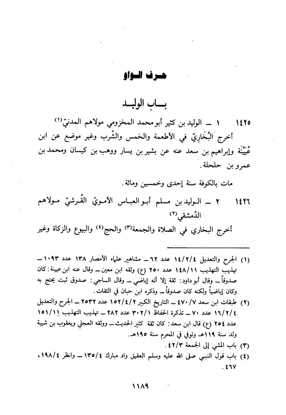 1425 - الْوَلِيد بن كثير أَبُو مُحَمَّد المَخْزُومِي مَوْلَاهُم الْمدنِي أخرج البُخَارِيّ فِي الْأَطْعِمَة وَالْخمس وَالشرب وَغير مَوضِع عَن بن عُيَيْنَة وَإِبْرَاهِيم بن سعد عَنهُ عَن بشير بن يسَار ووهب بن كيسَان وَمُحَمّد بن عَمْرو بن حلحلة مَاتَ بِالْكُوفَةِ سنة إِحْدَى وَخمسين وَمِائَة