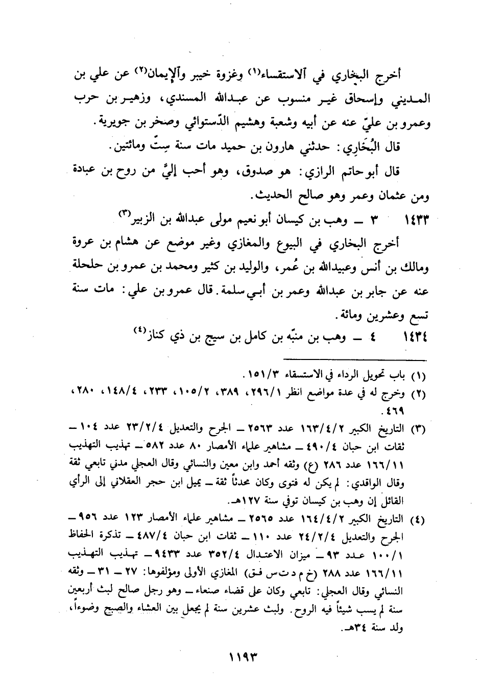 1433 - وهب بن كيسَان أَبُو نعيم مولى عبد الله بن الزبير أخرج البُخَارِيّ فِي الْبيُوع والمغازي وَغير مَوضِع عَن هِشَام بن عُرْوَة وَمَالك بن أنس وَعبيد الله بن عمر والوليد بن كثير وَمُحَمّد بن عَمْرو بن حلحلة عَنهُ عَن جَابر بن عبد الله وَعمر بن أبي سَلمَة قَالَ عَمْرو بن عَليّ مَاتَ سنة تسع وَعشْرين وَمِائَة