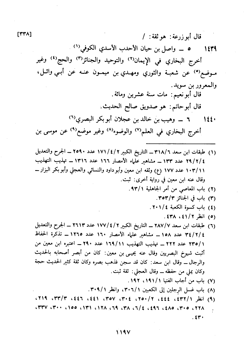 1439 - وَاصل بن حَيَّان الأحدب الْأَسدي الْكُوفِي أخرج البُخَارِيّ فِي الْإِيمَان والتوحيد والجنائز وَالْحج وَغير مَوضِع عَن شُعْبَة وَالثَّوْري ومهدي بن مَيْمُون عَنهُ عَن أبي وَائِل والمعرور بن سُوَيْد قَالَ أَبُو نعيم مَاتَ سنة عشْرين وَمِائَة قَالَ أَبُو حَاتِم هُوَ صَدُوق صَالح الحَدِيث