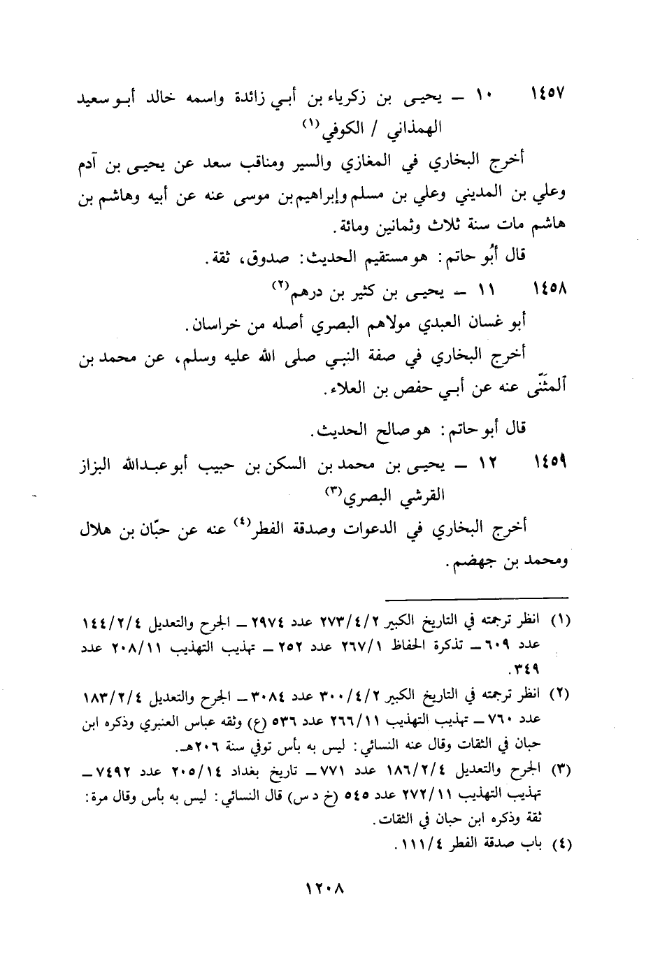 1457 - يحيى بن زَكَرِيَّا بن أبي زَائِدَة واسْمه خَالِد أَبُو سعيد الهمذاني الْكُوفِي أخرج البُخَارِيّ فِي الْمَغَازِي وَالسير ومناقب سعد عَن يحيى بن آدم وَعلي بن الْمَدِينِيّ وَعلي بن مُسلم وَإِبْرَاهِيم بن مُوسَى عَنهُ عَن أَبِيه وهَاشِم بن هَاشم مَاتَ سنة ثَلَاث وَثَمَانِينَ وَمِائَة قَالَ أَبُو حَاتِم هُوَ مُسْتَقِيم الحَدِيث صَدُوق ثِقَة