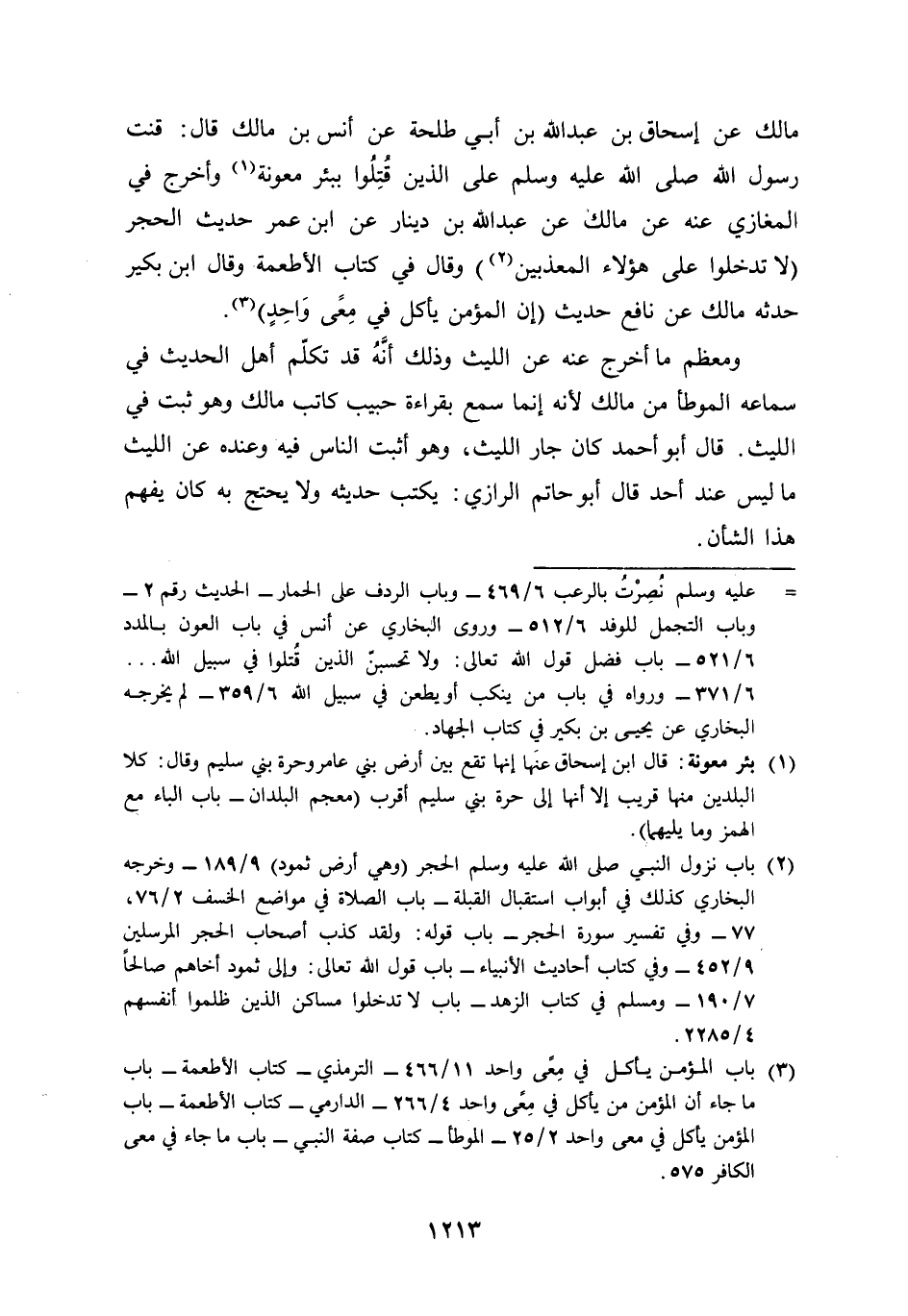 مَالك عَن نَافِع حَدِيث النُّعْمَان وَأخرج فِي الْجِهَاد عَنهُ عَن مَالك عَن إِسْحَاق بن عبد الله بن أبي طَلْحَة عَن أنس بن مَالك قَالَ قنت رَسُول الله صلى الله عَلَيْهِ وَسلم على الَّذين قتلوا ببئر مَعُونَة وَأخرج فِي الْمَغَازِي عَنهُ عَن مَالك عَن عبد الله بن دِينَار عَن بن عمر حَدِيث الْحجر لَا تدْخلُوا على هَؤُلَاءِ الْمُعَذَّبين وَقَالَ فِي كتاب الْأَطْعِمَة وَقَالَ بن بكير حَدثهُ مَالك عَن نَافِع حَدِيث إِن الْمُؤمن يَأْكُل فِي معي وَاحِد ومعظم مَا أخرج عَنهُ عَن اللَّيْث وَذَلِكَ أَنه قد تكلم أهل الحَدِيث فِي سَمَاعه الْمُوَطَّأ من مَالك لِأَنَّهُ إِنَّمَا سمع بِقِرَاءَة حبيب كَاتب مَالك وَهُوَ ثَبت فِي اللَّيْث قَالَ أَبُو أَحْمد كَانَ جَار اللَّيْث وَهُوَ أثبت النَّاس فِيهِ وَعِنْده عَن اللَّيْث مَا لَيْسَ عِنْد أحد قَالَ أَبُو حَاتِم الرَّازِيّ يكْتب حَدِيثه وَلَا يحْتَج بِهِ كَانَ يفهم هَذَا الشَّأْن