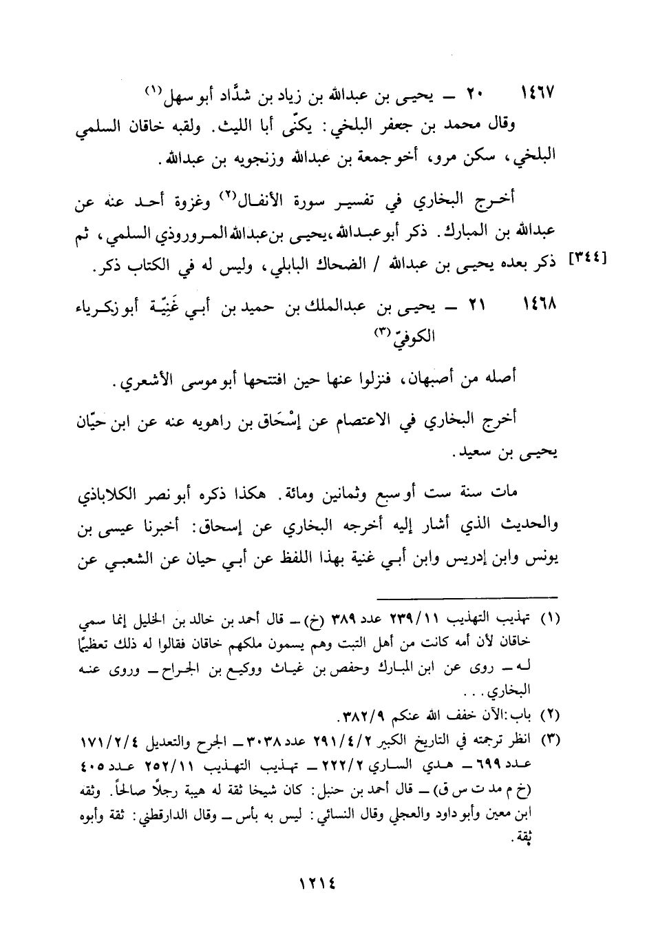 1467 - يحيى بن عبد الله بن زِيَاد بن شَدَّاد أَبُو سهل وَقَالَ مُحَمَّد بن جَعْفَر الْبَلْخِي يكنى أَبَا اللَّيْث ولقبه خاقَان السّلمِيّ الْبَلْخِي سكن مرو أَخُو جُمُعَة بن عبد الله وزنجويه بن عبد الله أخرج البُخَارِيّ فِي تَفْسِير سُورَة الْأَنْفَال وغزوة أحد عَنهُ عَن عبد الله بن الْمُبَارك ذكر أَبُو عبد الله يحيى بن عبد الله المروروذي السّلمِيّ ثمَّ ذكر بعده يحيى بن عبد الله الضَّحَّاك البابلي وَلَيْسَ لَهُ فِي الْكتاب ذكر