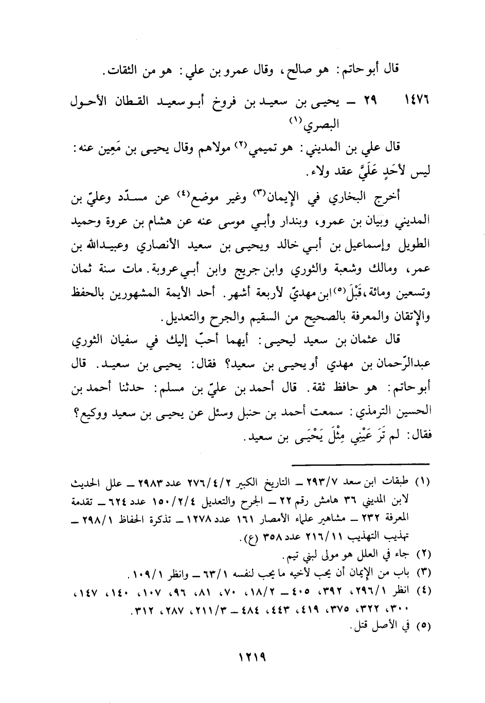 1476 - يحيى بن سعيد بن فروخ أَبُو سعيد الْقطَّان الْأَحول الْبَصْرِيّ قَالَ عَليّ بن الْمَدِينِيّ هُوَ تميمي مَوْلَاهُم وَقَالَ يحيى بن معِين عَنهُ لَيْسَ لأحد عَليّ عقد وَلَاء أخرج البُخَارِيّ فِي الْإِيمَان وَغير مَوضِع عَن مُسَدّد وَعلي بن الْمَدِينِيّ وَبَيَان بن عَمْرو وَبُنْدَار وَأبي مُوسَى عَنهُ عَن هِشَام بن عُرْوَة وَحميد الطَّوِيل وَإِسْمَاعِيل بن أبي خَالِد وَيحيى بن سعيد الْأنْصَارِيّ وَعبيد الله بن عمر وَمَالك وَشعْبَة وَالثَّوْري وَابْن جريج وَابْن أبي عرُوبَة مَاتَ سنة ثَمَان وَتِسْعين وَمِائَة قبل بن مهْدي لأربعة أشهر أحد الأيمة الْمَشْهُورين بِالْحِفْظِ والإتقان والمعرفة بِالصَّحِيحِ من السقيم وَالْجرْح وَالتَّعْدِيل قَالَ عُثْمَان بن سعيد ليحيى أَيهمَا أحب إِلَيْك فِي سُفْيَان الثَّوْريّ عبد الرَّحْمَن بن مهْدي أَو يحيى بن سعيد فَقَالَ يحيى بن سعيد قَالَ أَبُو حَاتِم هُوَ حَافظ ثِقَة قَالَ أَحْمد بن عَليّ بن مُسلم حَدثنَا أَحْمد بن الْحُسَيْن التِّرْمِذِيّ سَمِعت أَحْمد بن حَنْبَل وَسُئِلَ عَن يحيى بن سعيد ووكيع فَقَالَ لم تَرَ عَيْني مثل يحيى بن سعيد