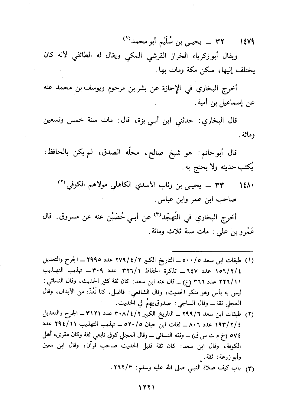 1480 - يحيى بن وثاب الْأَسدي الْكَاهِلِي مَوْلَاهُم الْكُوفِي صَاحب بن عمر وَابْن عَبَّاس أخرج البُخَارِيّ فِي التَّهَجُّد عَن أبي حُصَيْن عَنهُ عَن مَسْرُوق قَالَ عَمْرو بن عَليّ مَاتَ سنة ثَلَاث وَمِائَة